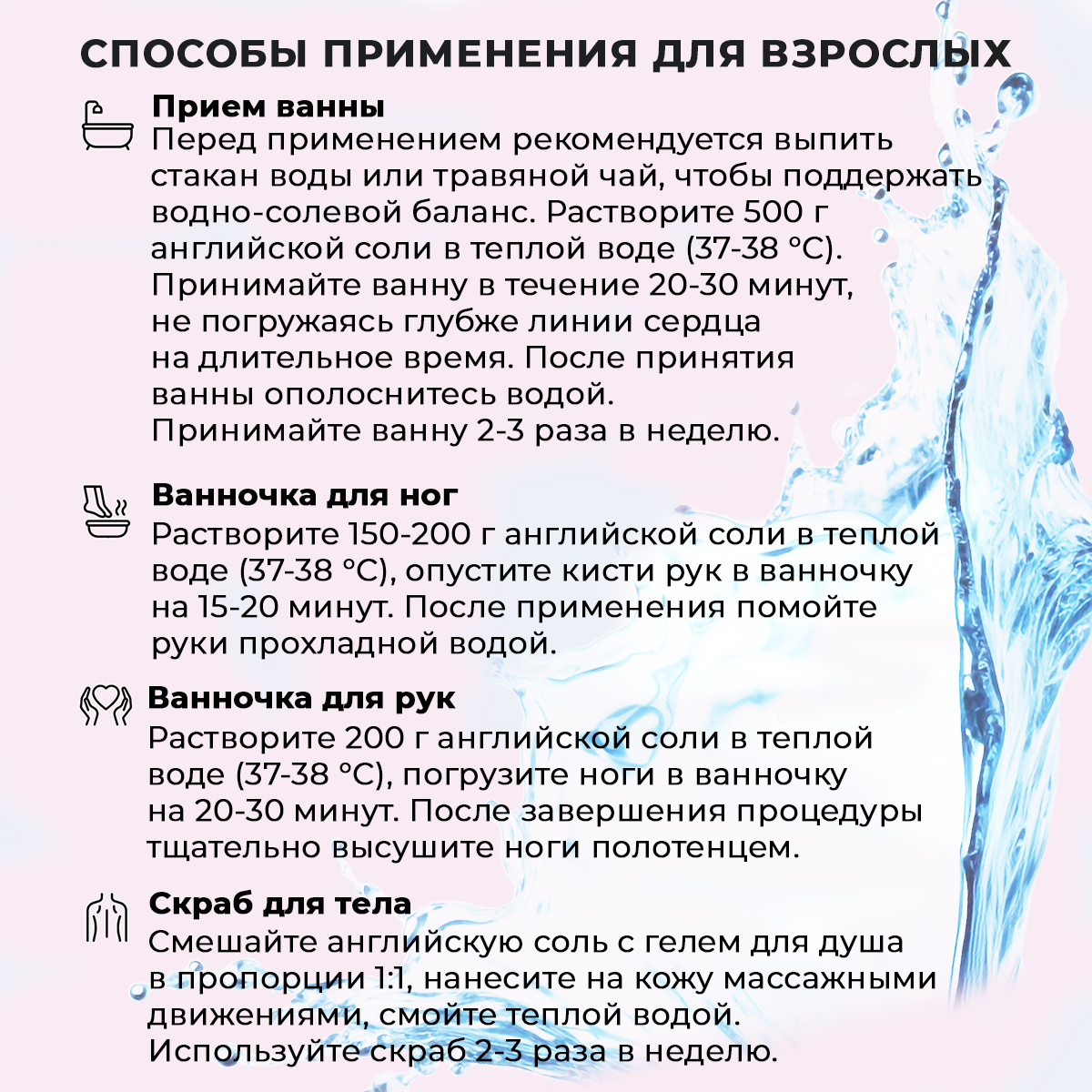 | Способ применения | Ванна с английской солью: растворите 500 г соли в теплой воде (37-38°С). Принимайте ванну в течение 15-20 минут в положении сидя или полулежа. После ванны примите прохладный душ. Скраб с английской солью: смешайте английскую соль с гелем для душа в пропорции 1:1 или используйте соль в чистом виде. Нанесите на распаренную кожу, помассируйте, уделяя особое внимание участкам с целлюлитом. Смойте прохладной водой. |