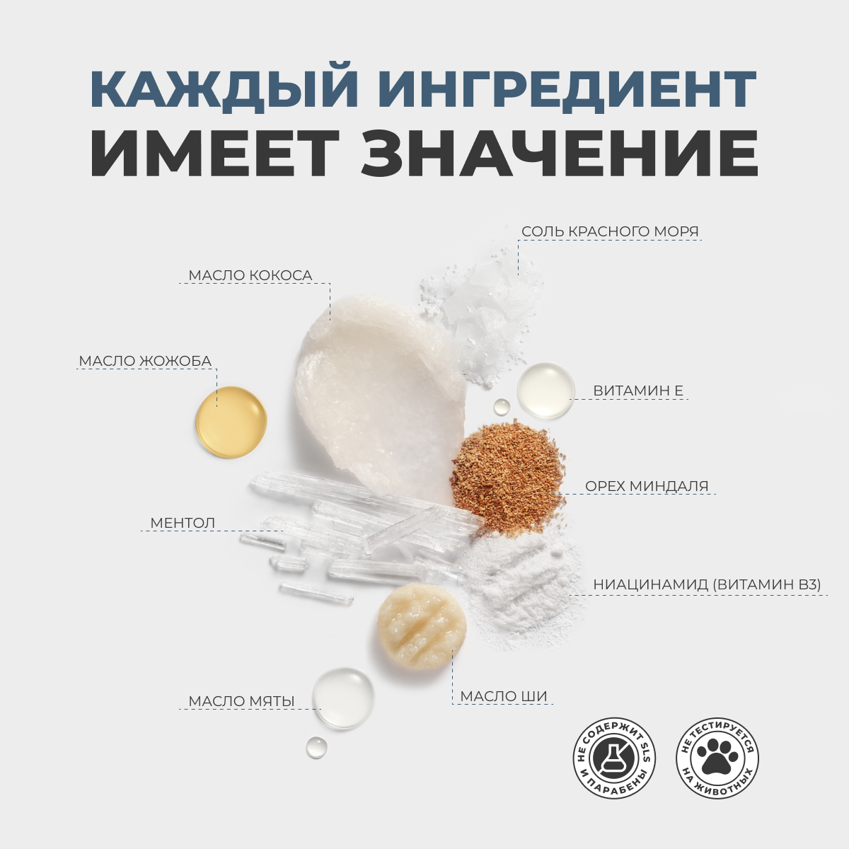 | Активный ингредиент | витамин E / ментол / морская соль / ниацинамид |