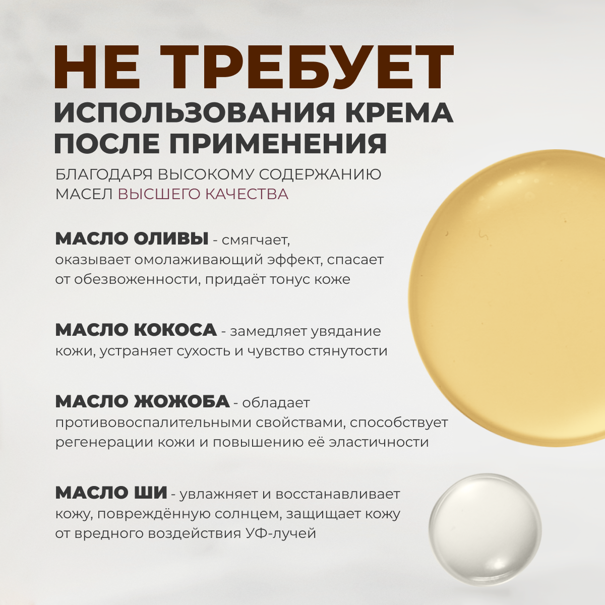 | Масла и экстракты | кокосовое масло / масло жожоба / масло мяты / масло ши (карите) / оливковое масло |