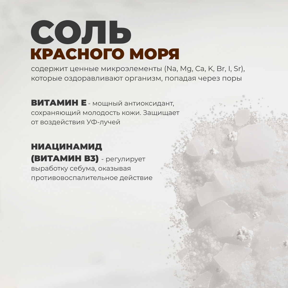 | Активный ингредиент | витамин E / ментол / морская соль / ниацинамид |