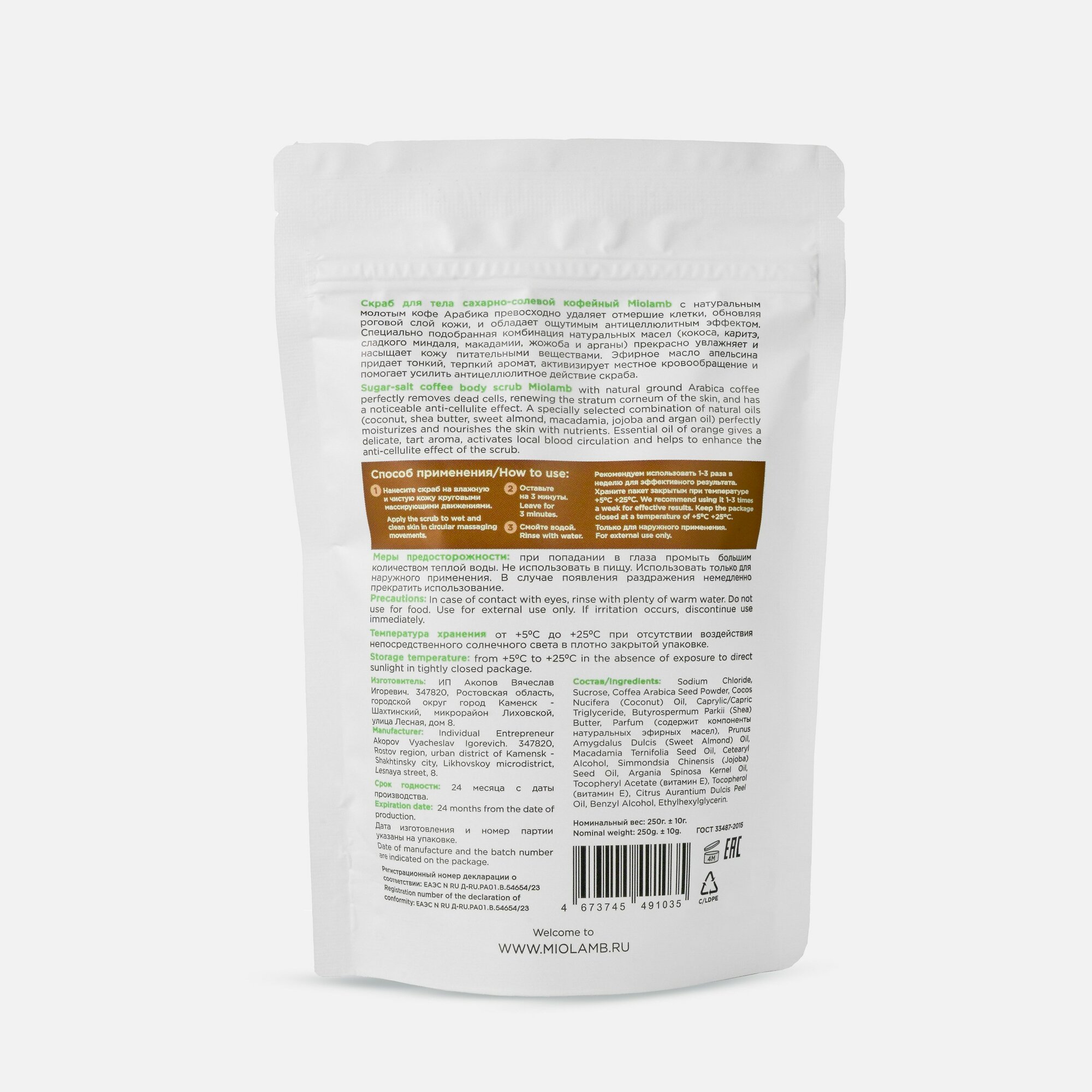Купить Скраб для тела кофейный антицеллюлитный сахарно - солевой с натуральными маслами (7 видов масел) MIOLAMB 250гр.