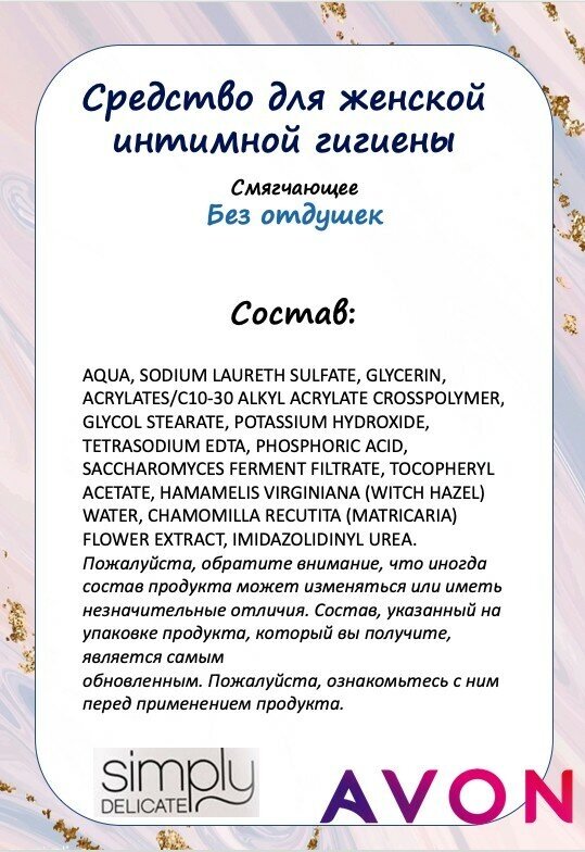 Ниже Вы можете прочитать отзывы на AVON/ Эйвон Средство для женской интимной гигиены Care (Каре) "Смягчающее", 250мл, ознакомится с подробными характеристиками, посмотреть интересные обзоры и фотографии на AVON/ Эйвон Средство для женской интимной гигиены Care (Каре) "Смягчающее", 250мл.