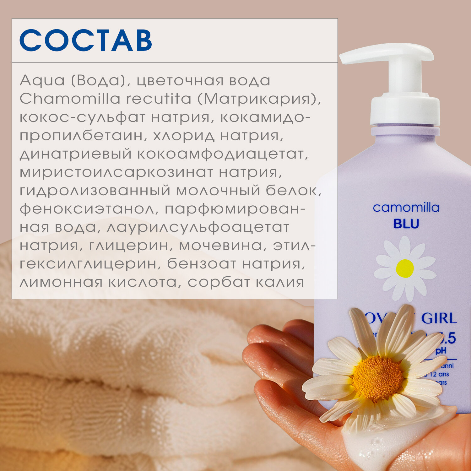 | Состав | Aqua [Water], Chamomilla recutita (Matricaria) flower water, Sodium coco-sulfate, Cocamidopropyl betaine, Sodium chloride, Disodium cocoamphodiacetate, Sodium myristoyl sarcosinate, Hydrolyzed milk protein, Phenoxyethanol, Parfum [Fragrance], Sodium lauryl sulfoacetate, Glycerin, Urea, Ethylhexylglycerin, Sodium benzoate, Citric acid, Potassium sorbate. |
