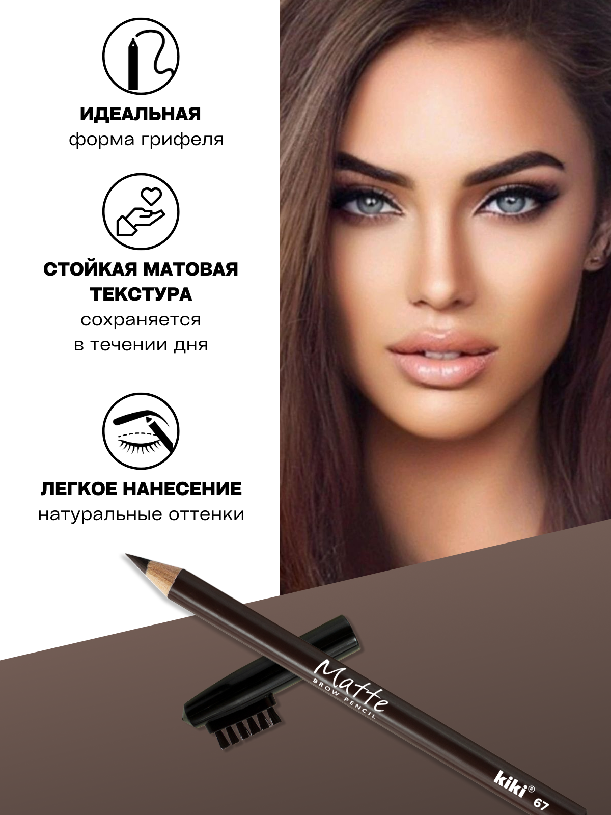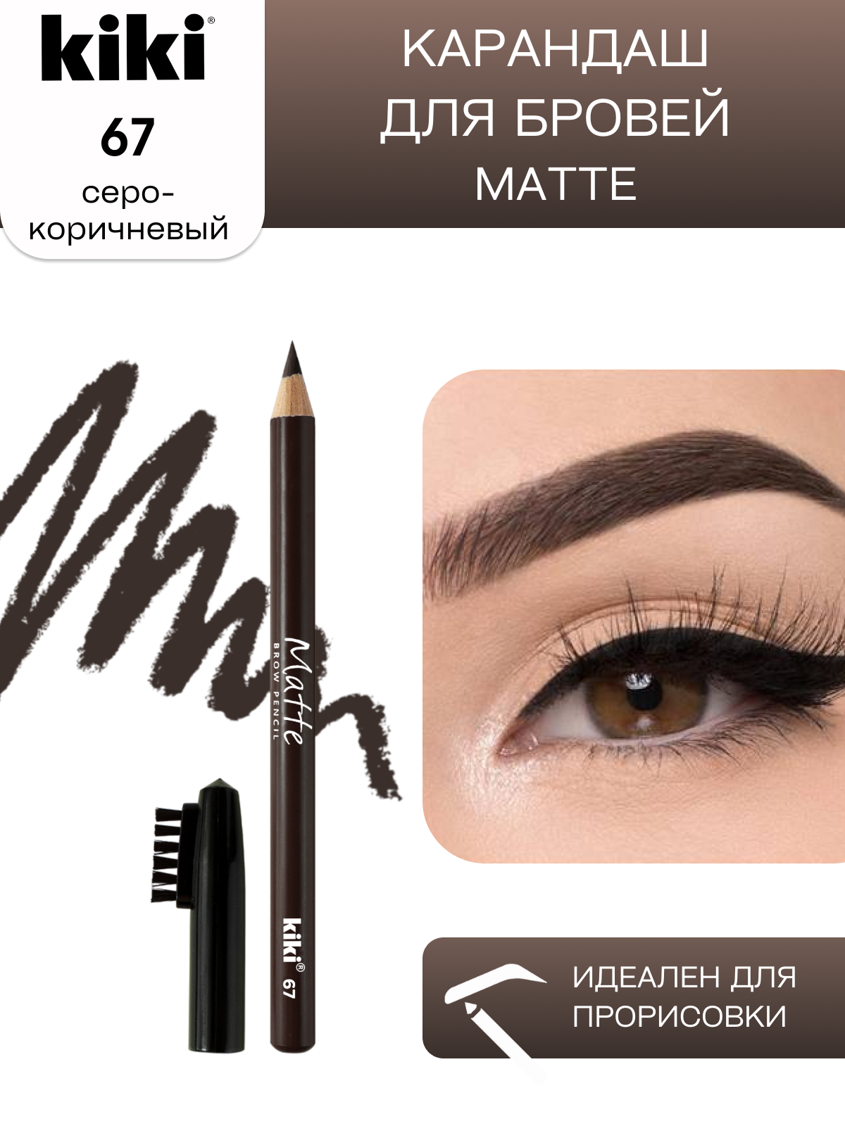 Карандаш для бровей kiki eyebrow matte тон 67 серо-коричневый с щеточкой-расческой для моделирования и прорисовки, стойкий макияж бровей, кики