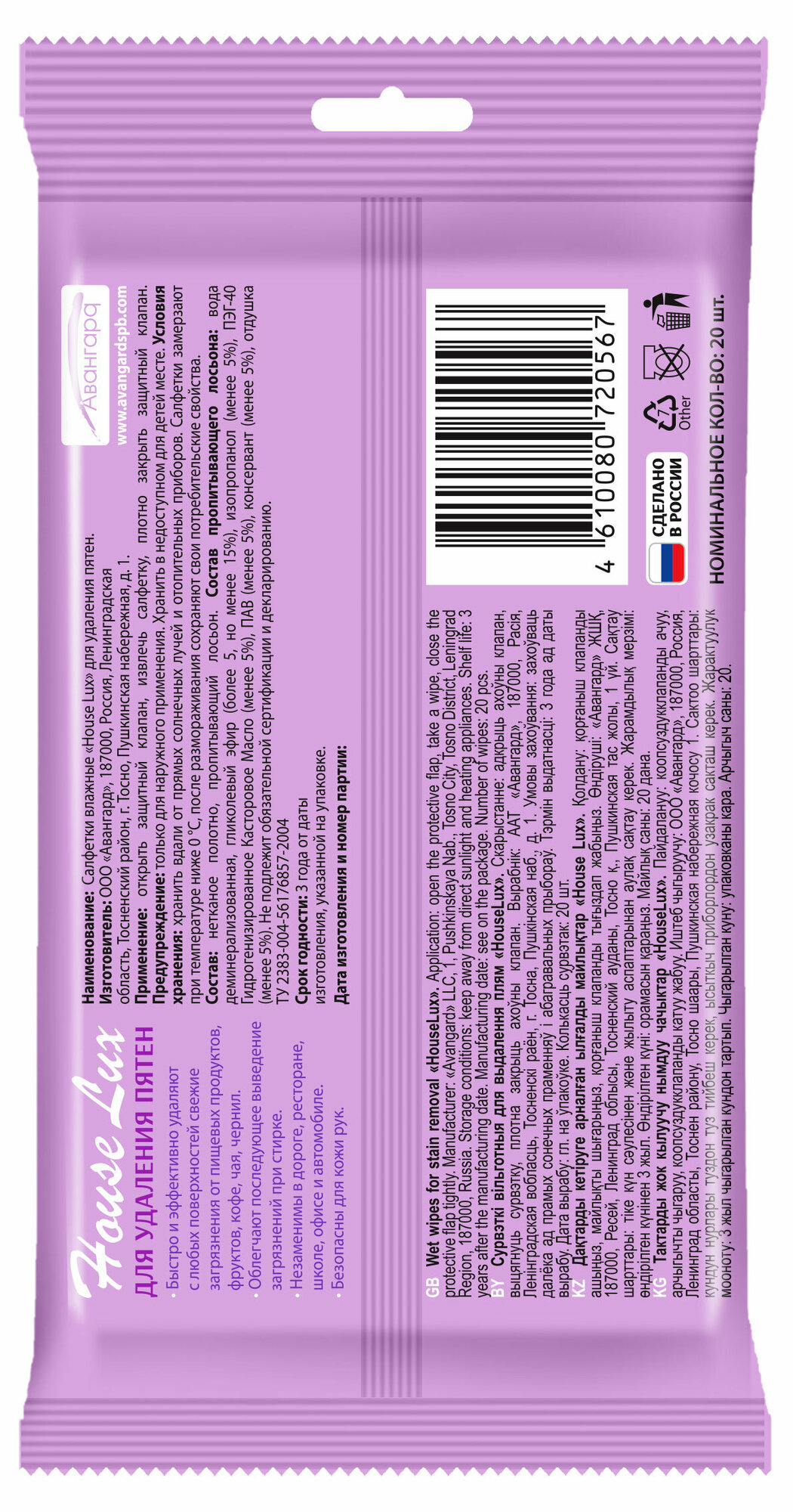 Салфетки влажные HOUSE LUX 20шт д/удаления пятен интересное: