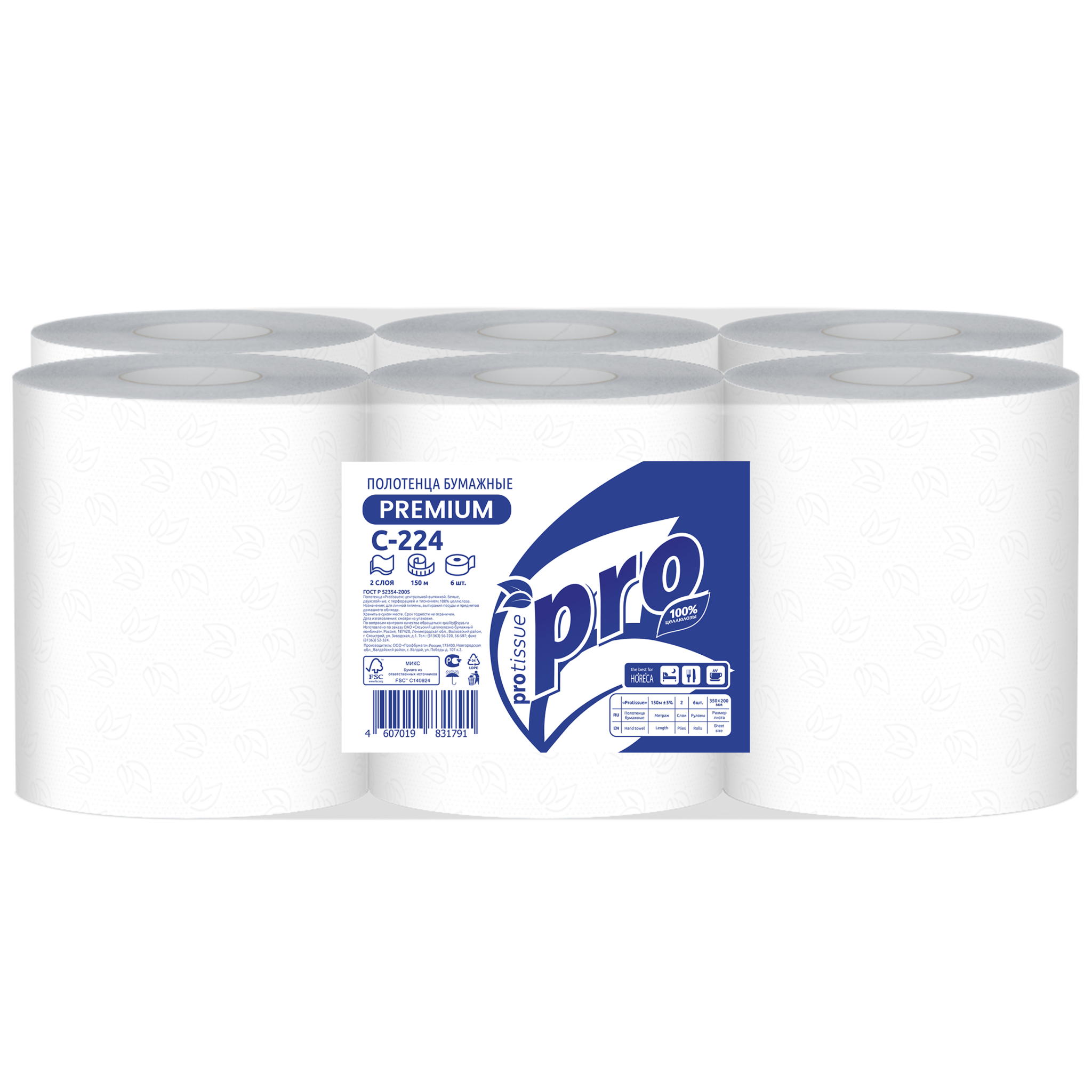 Полотенца бумажные рулонные PROtissue С224, 2 сл., 150 м., 6 рулонов, Premium