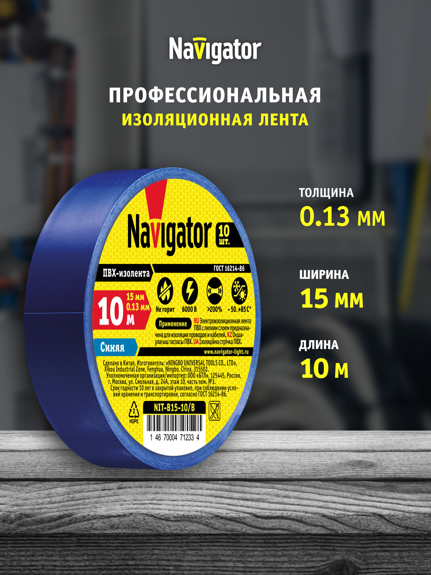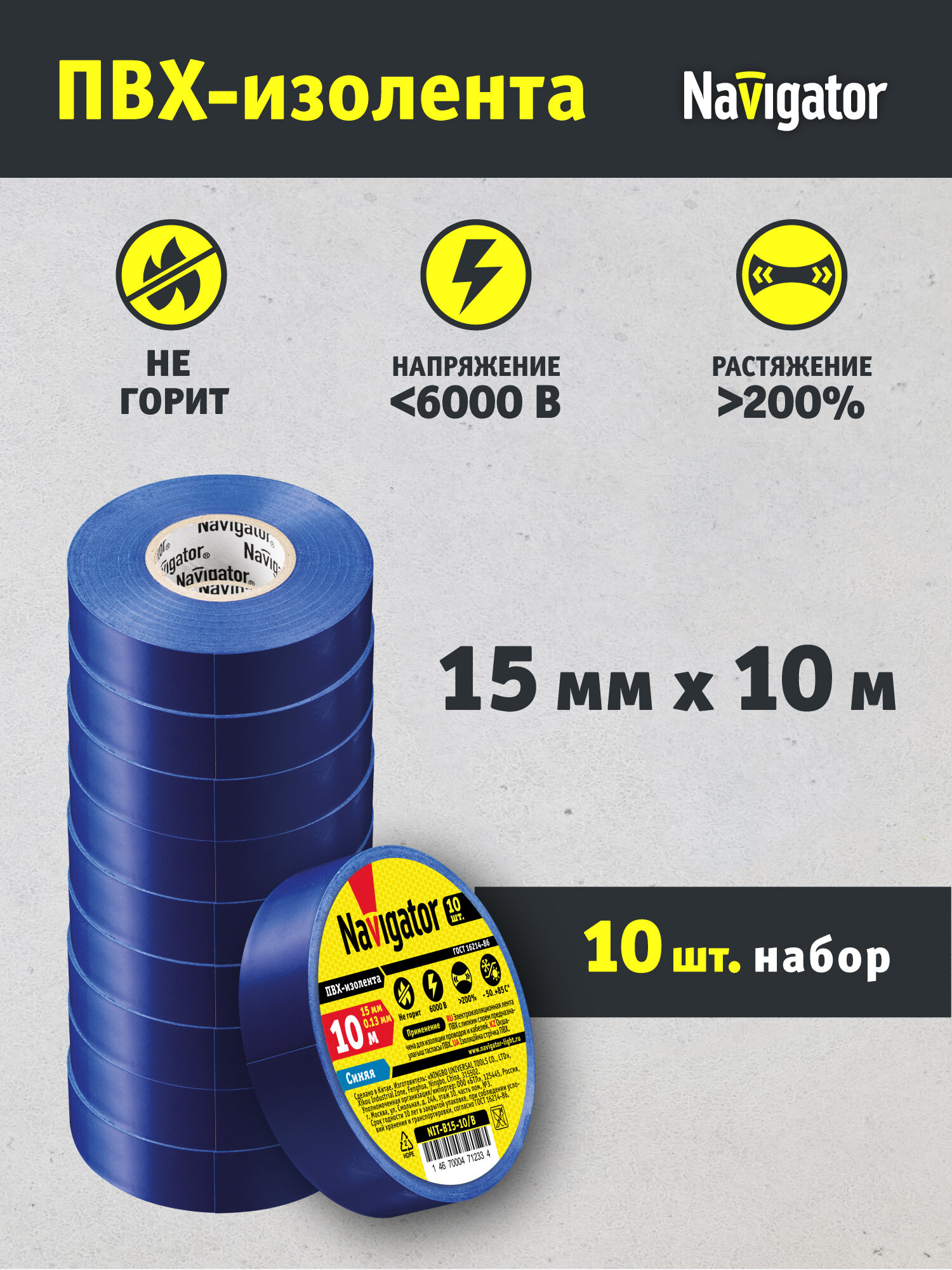 Изолента ПВХ Navigator, синяя 71 233, 15 мм * 10 м, набор 10 шт интересное: