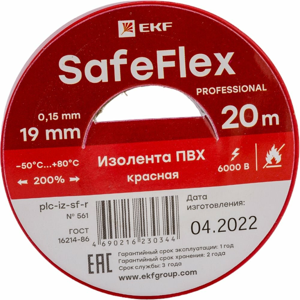 Изолента ПВХ красная 19мм 20м серии SafeFlex | код plc-iz-sf-r | EKF (2шт. в упак.)