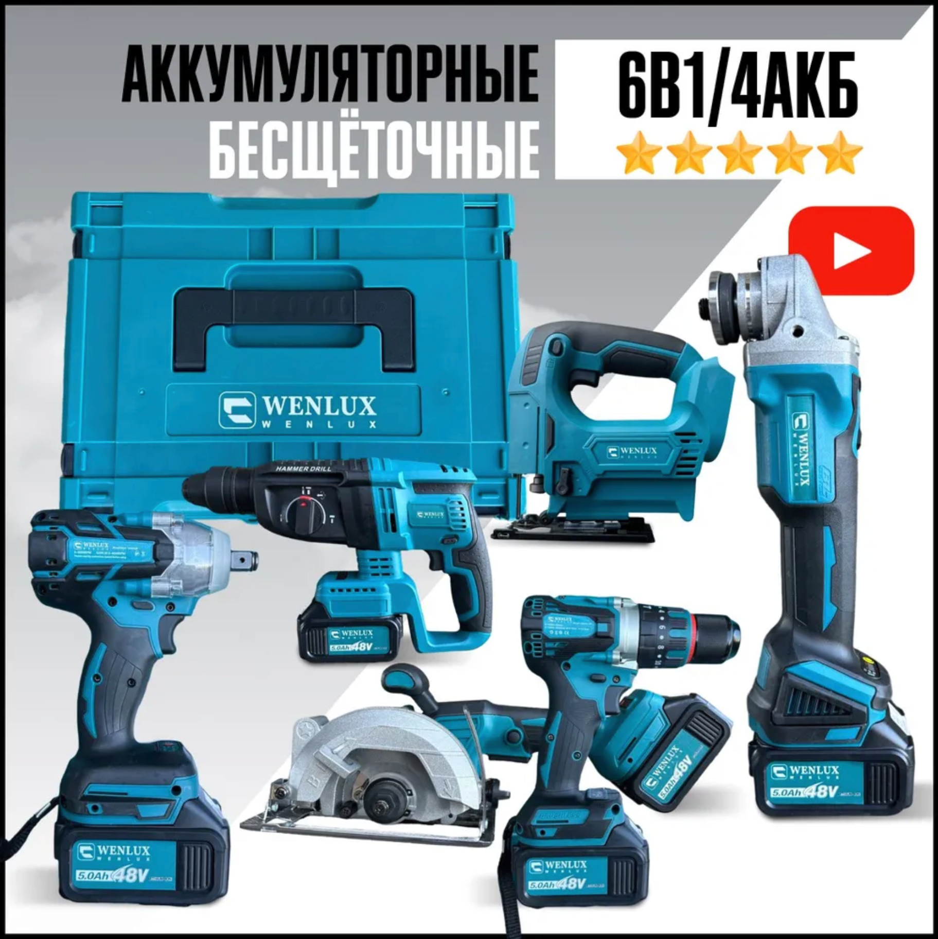Ниже Вы можете прочитать отзывы на Набор электроинструментов бесщеточных 6в1 WENLUX / Шуруповерт, Гайковёрт, Перфоратор, Болгарка (ушм) / аккумляторный, ознакомится с подробными характеристиками, посмотреть интересные обзоры и фотографии на Набор электроинструментов бесщеточных 6в1 WENLUX / Шуруповерт, Гайковёрт, Перфоратор, Болгарка (ушм) / аккумляторный.