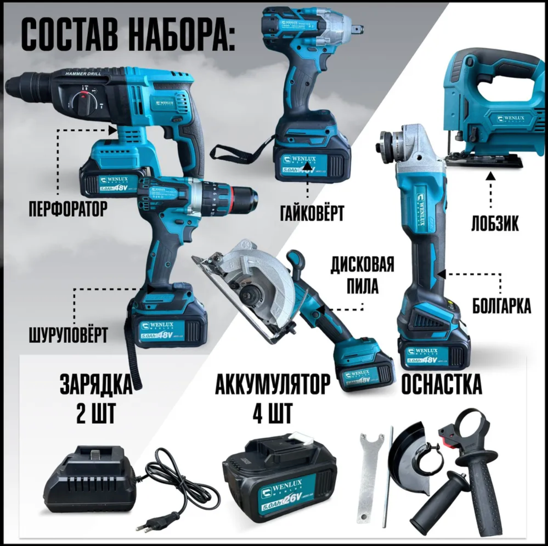 Набор электроинструментов бесщеточных 6в1 WENLUX / Шуруповерт, Гайковёрт, Перфоратор, Болгарка (ушм) / аккумляторный интересное: