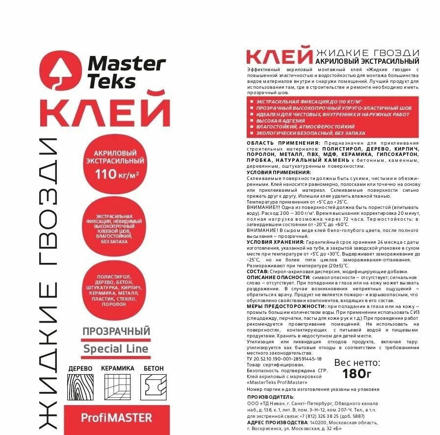 Клей акриловый экстрасильный "Жидкие гвозди" 110 кг/м2 MasterTeks PM, прозрачный, 180 мл интересное: