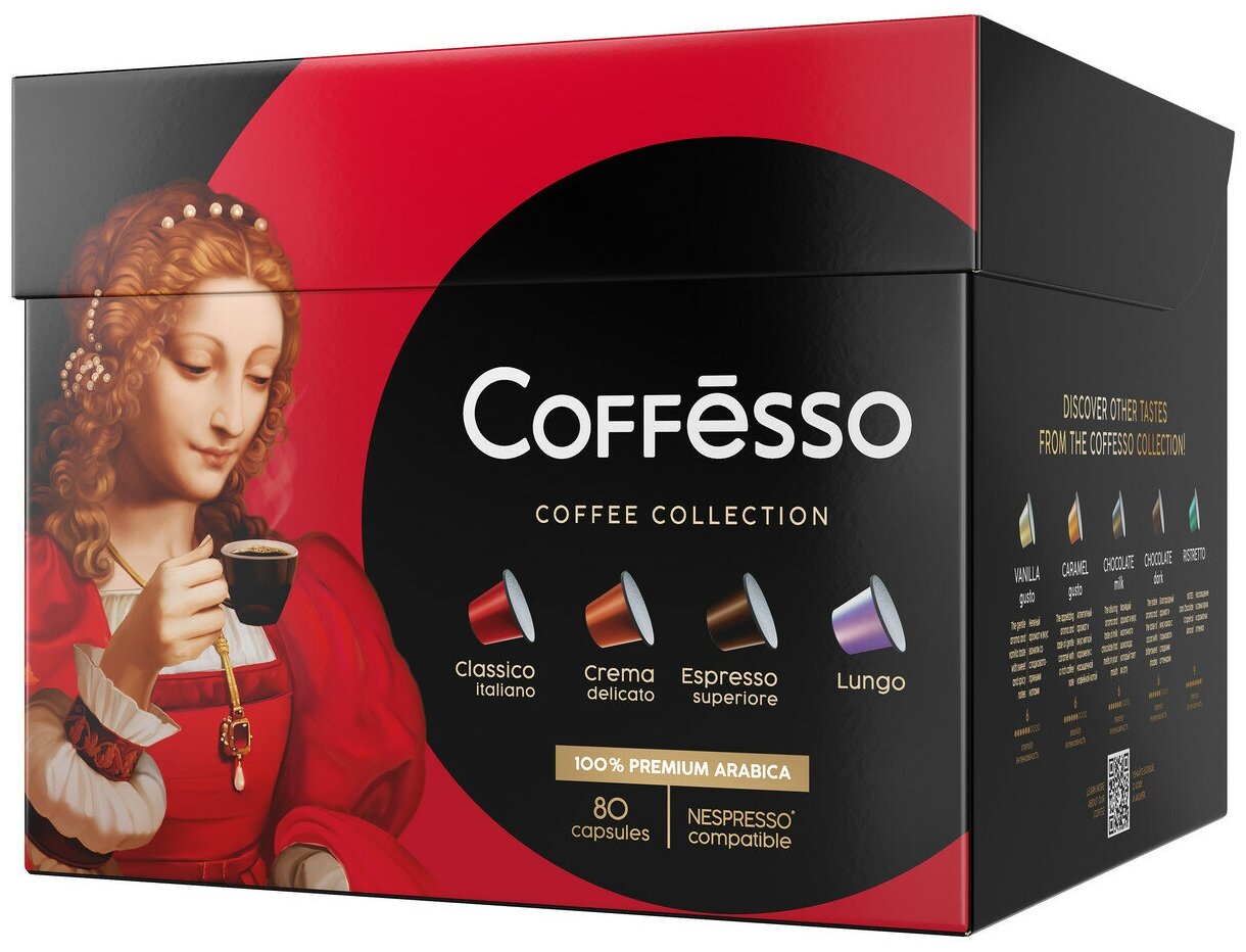 Купить Кофе Coffesso "ассорти 4 вкуса" 80 капсул, classico Italiano 20 шт по 5 г, crema delicato 20 шт по 5 г, espresso superiore 20 шт по 5 г, lungo 20 шт по 5 г