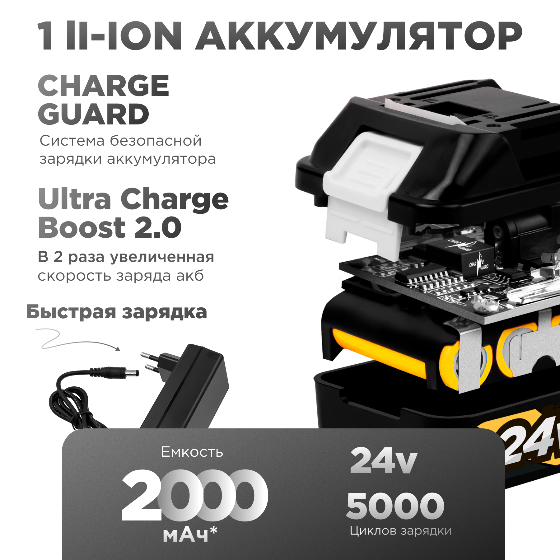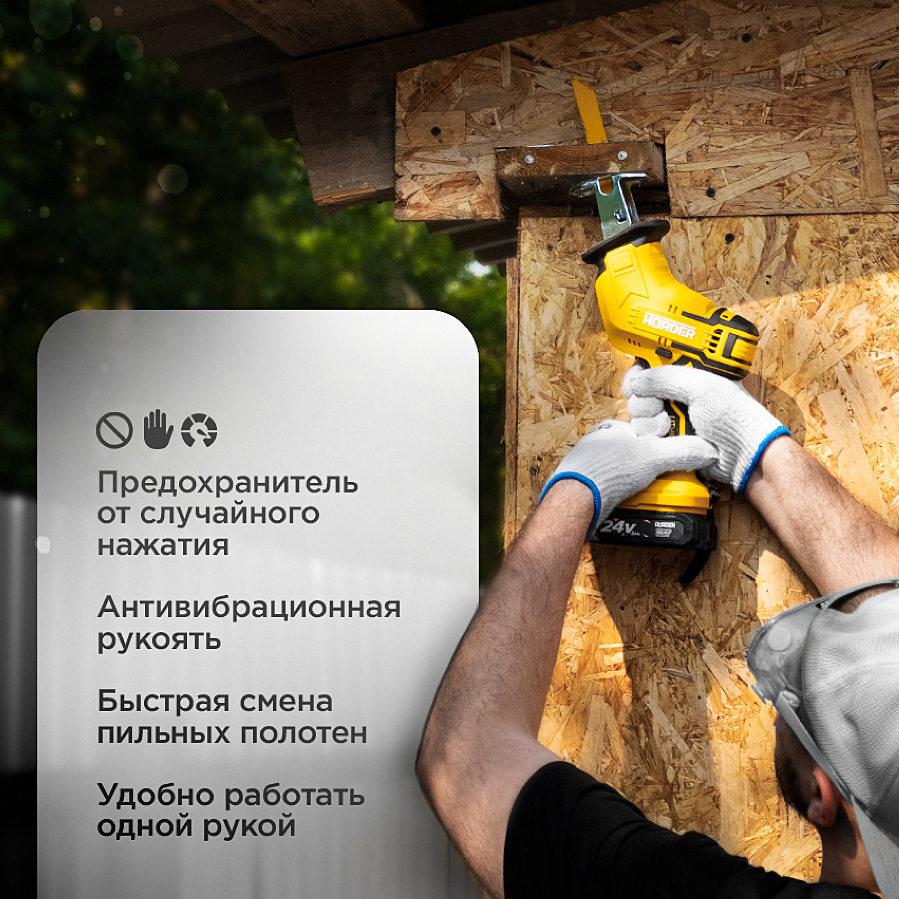 Пила сабельная HORDER PRS-250 в кейсе 1 аккумулятор 24 В 2 Ач, 3000 ход/мин 4 пильных полотна, подсветка, бесключевая замена пилки интересное: