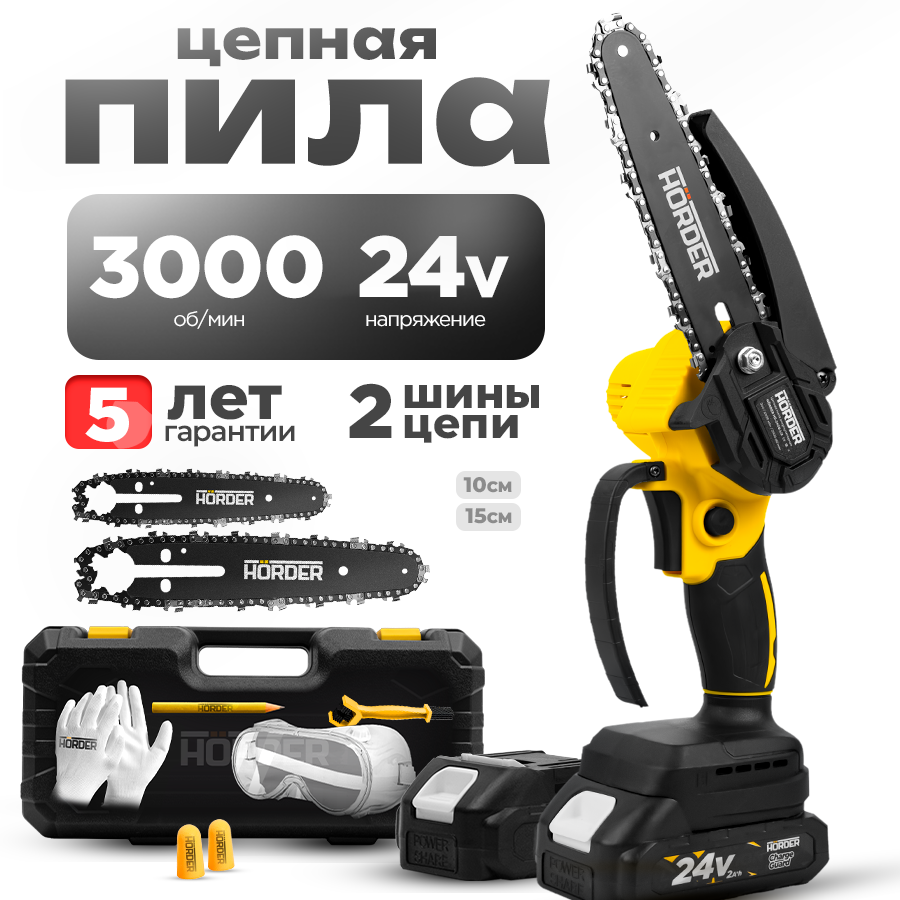 Цепная мини пила HORDER HS-2406 Li2 в кейсе, 2 Li-ion аккумулятора 24 В 2 Ач, 3000 об/мин, 2 шины, 2 цепи 10/15 см интересное: