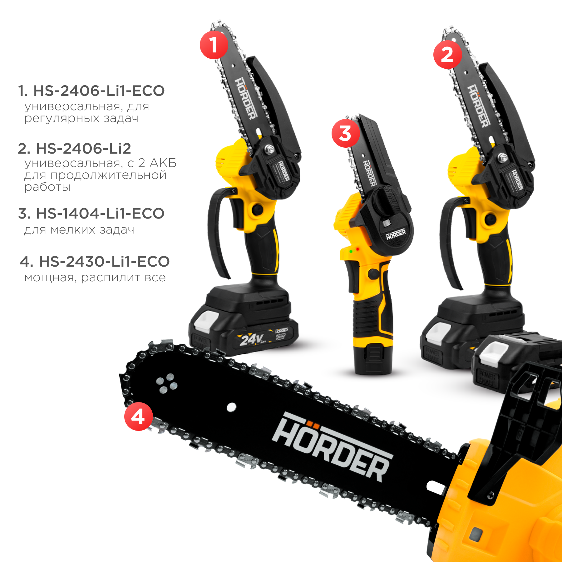 Купить Цепная пила HORDER-HS-2400-Li1, Li-ion аккумулятор 24 В 2 Ач, в кейсе 3 цепи 3 шины, 10/15/20 см