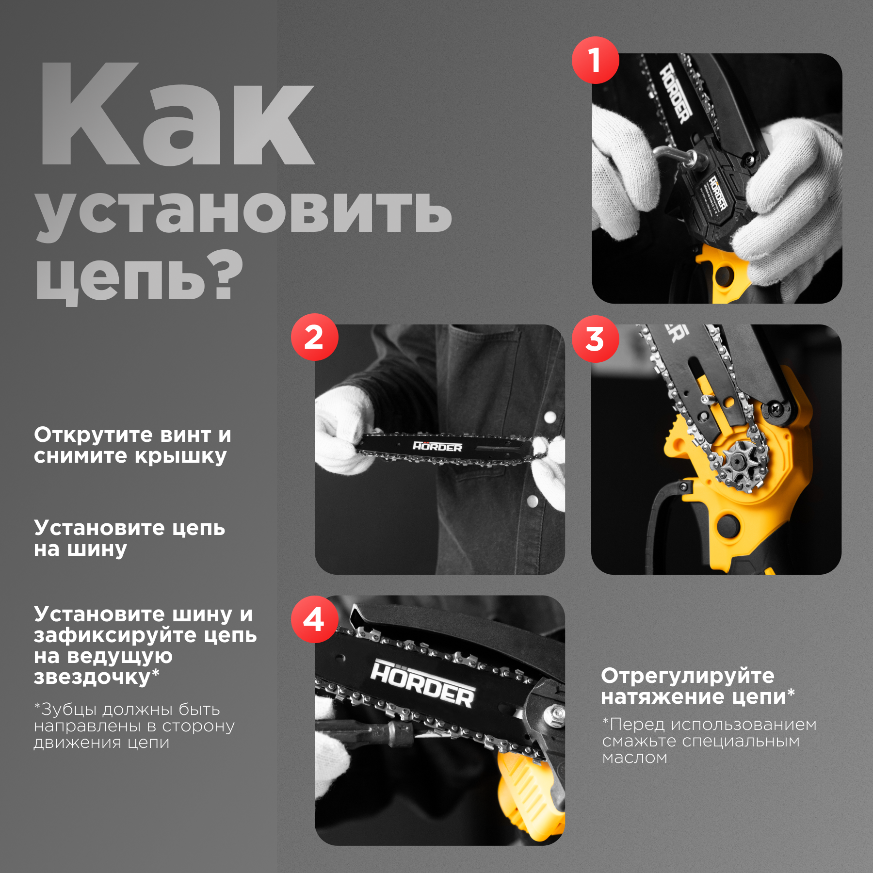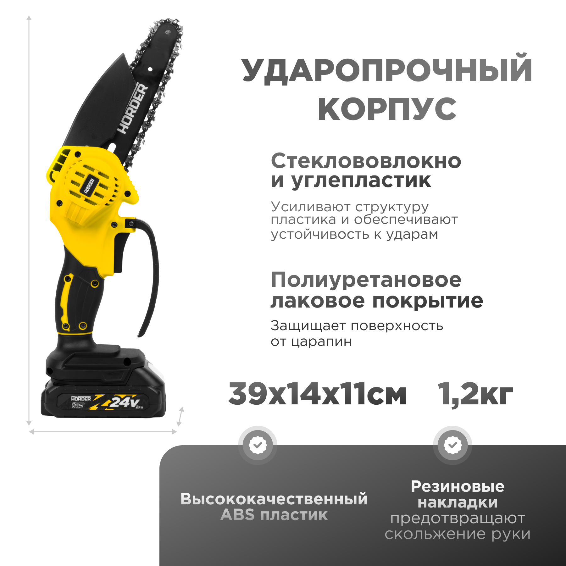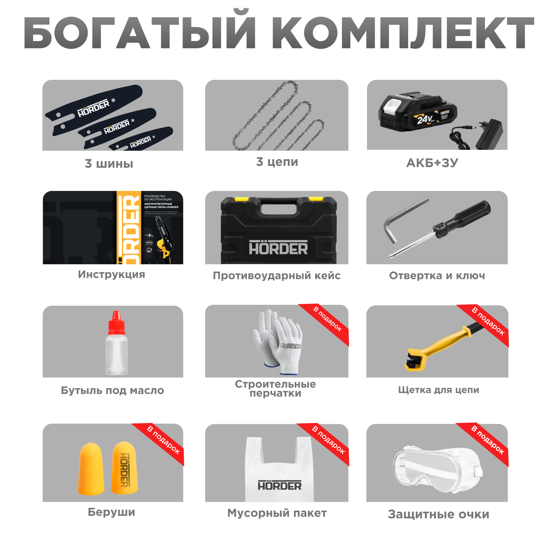 Цепная пила HORDER-HS-2400-Li1, Li-ion аккумулятор 24 В 2 Ач, в кейсе 3 цепи 3 шины, 10/15/20 см интересное: