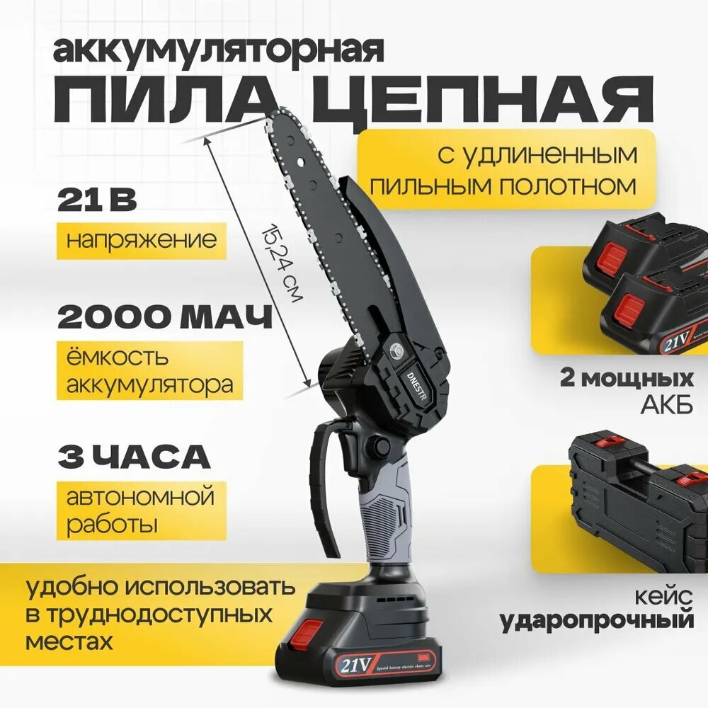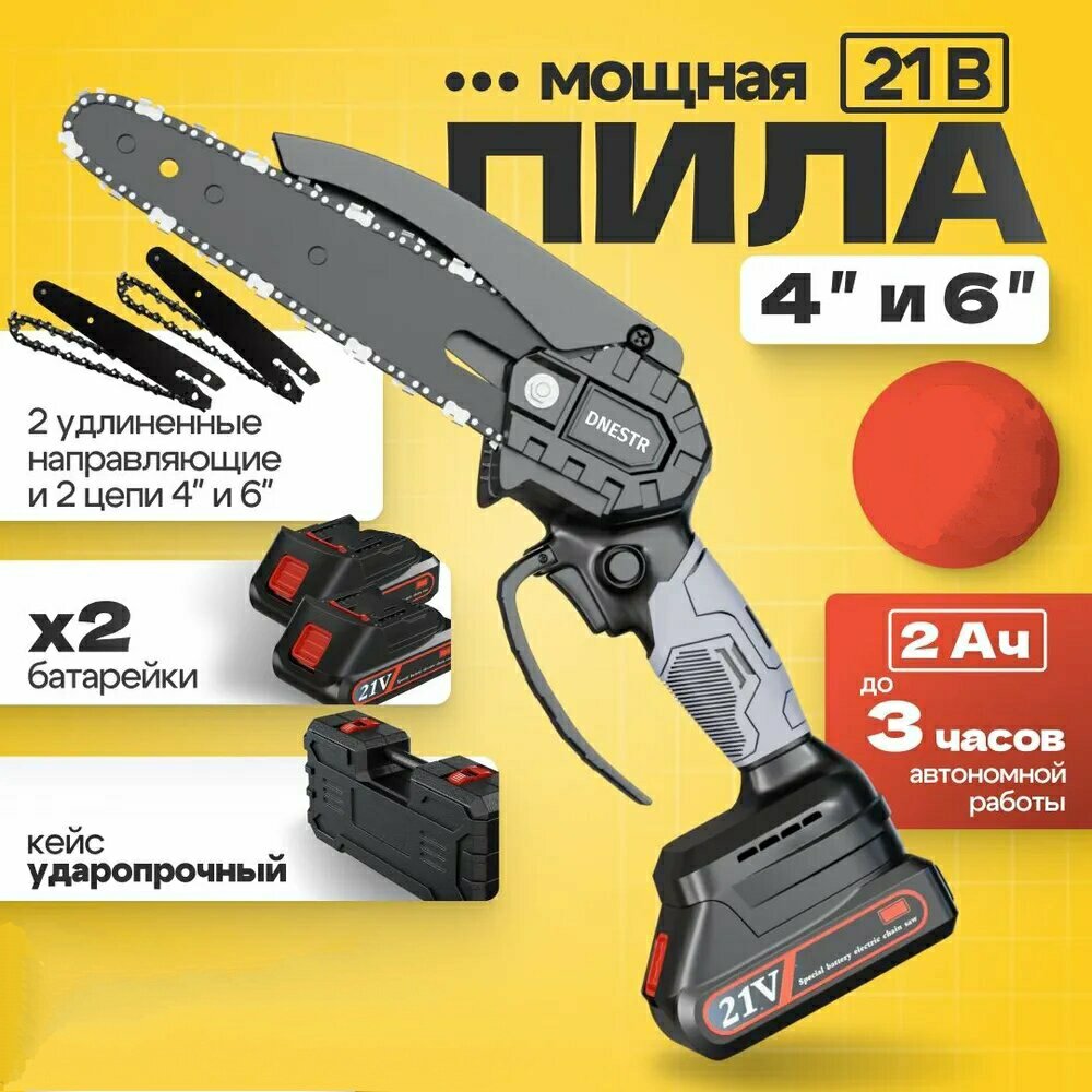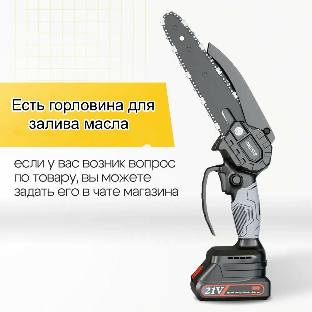 Садовая аккумуляторная цепная мини пила с масляным насосом (сучкорез) 6 и 4 дюйма / Также 2 шины, 2 цепи, 2 аккумулятора интересное: