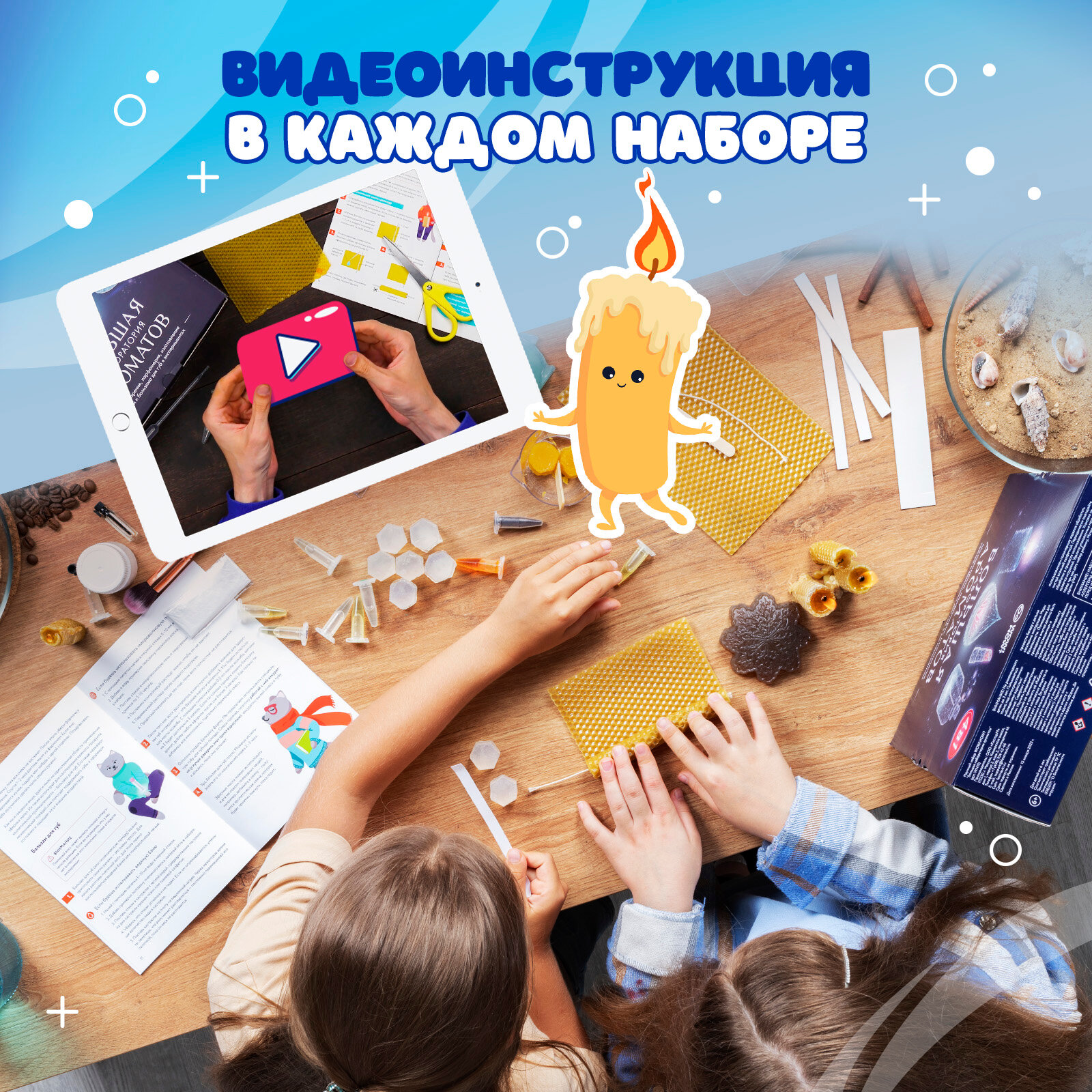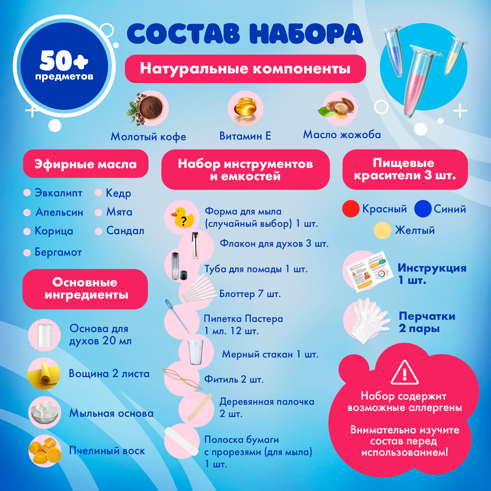 | Состав набора | В набор входит 8 экспериментов: «Мыловарение», «Ароматические свечи», «Духи своими руками», «Гипсовые фигурки», «Бомбочка для ванны», «Разноцветный слайм», «Бальзам для губ», «Мастерская художника». Все необходимые ингредиенты и инструкция уже входят в состав набора. |