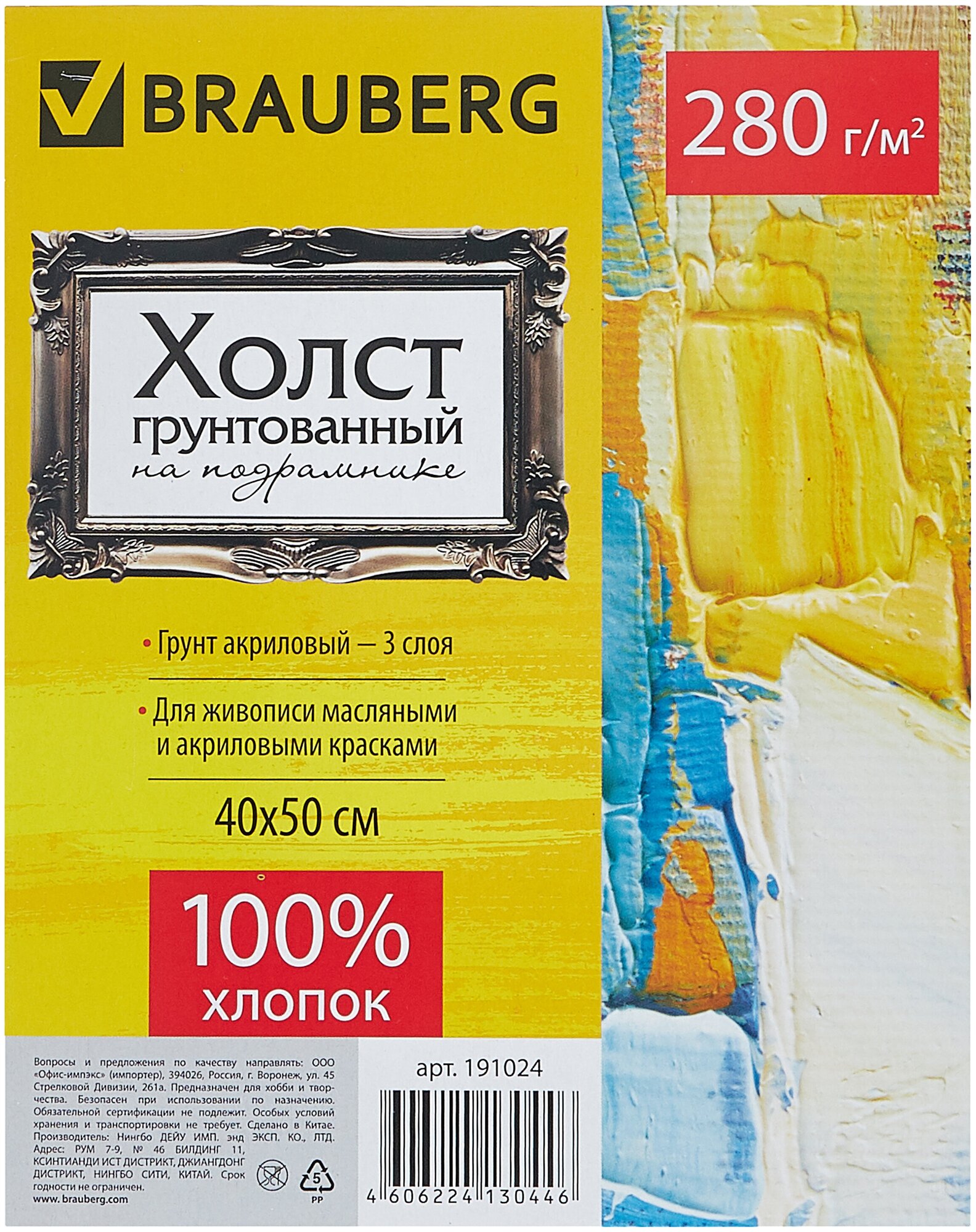 Купить Холст на подрамнике BRAUBERG ART DEBUT 40х50см грунтованный 100% хлопок мелк.зерно 191024