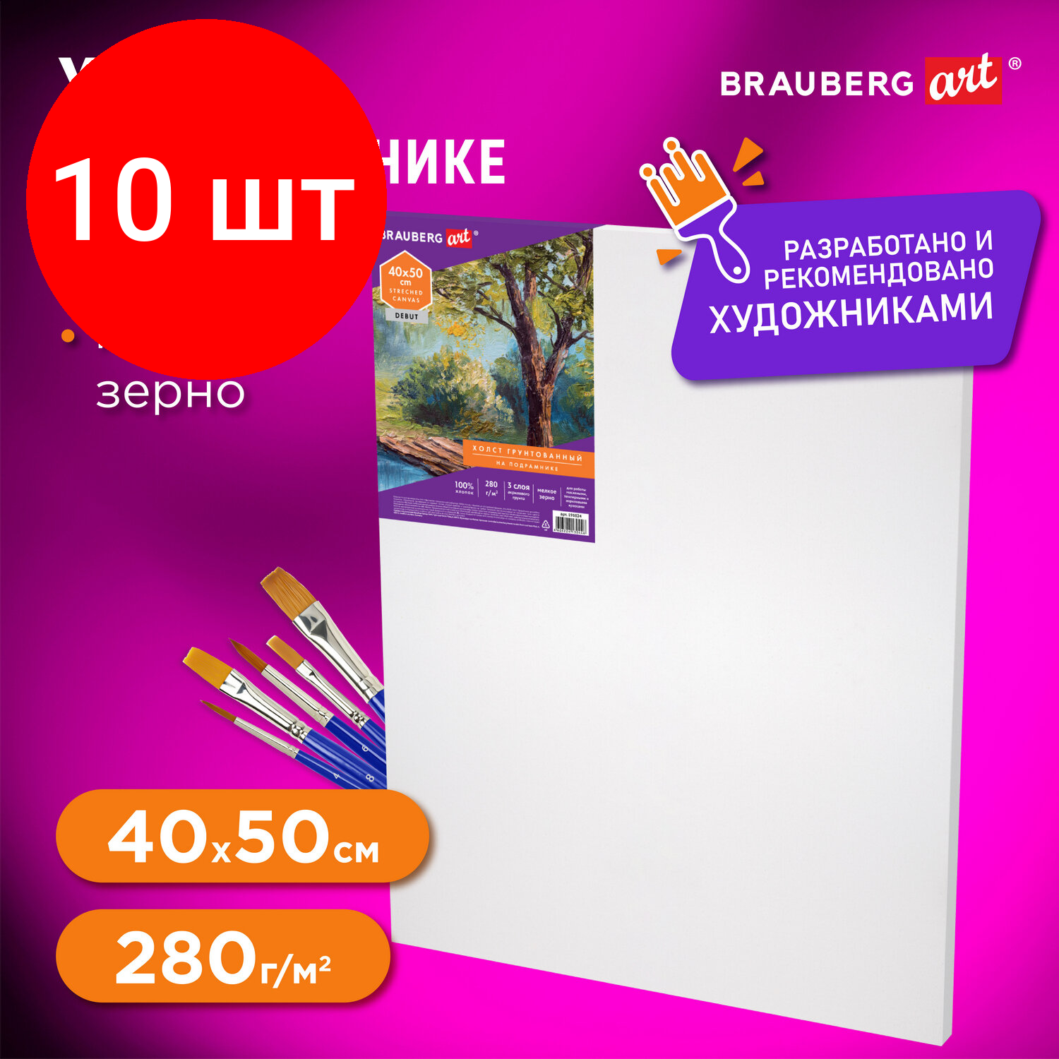 Купить Комплект 10 шт, Холст на подрамнике BRAUBERG ART DEBUT, 40х50см, грунтованный, 100% хлопок, мелкое зерно, 191024