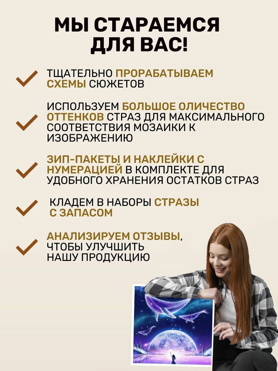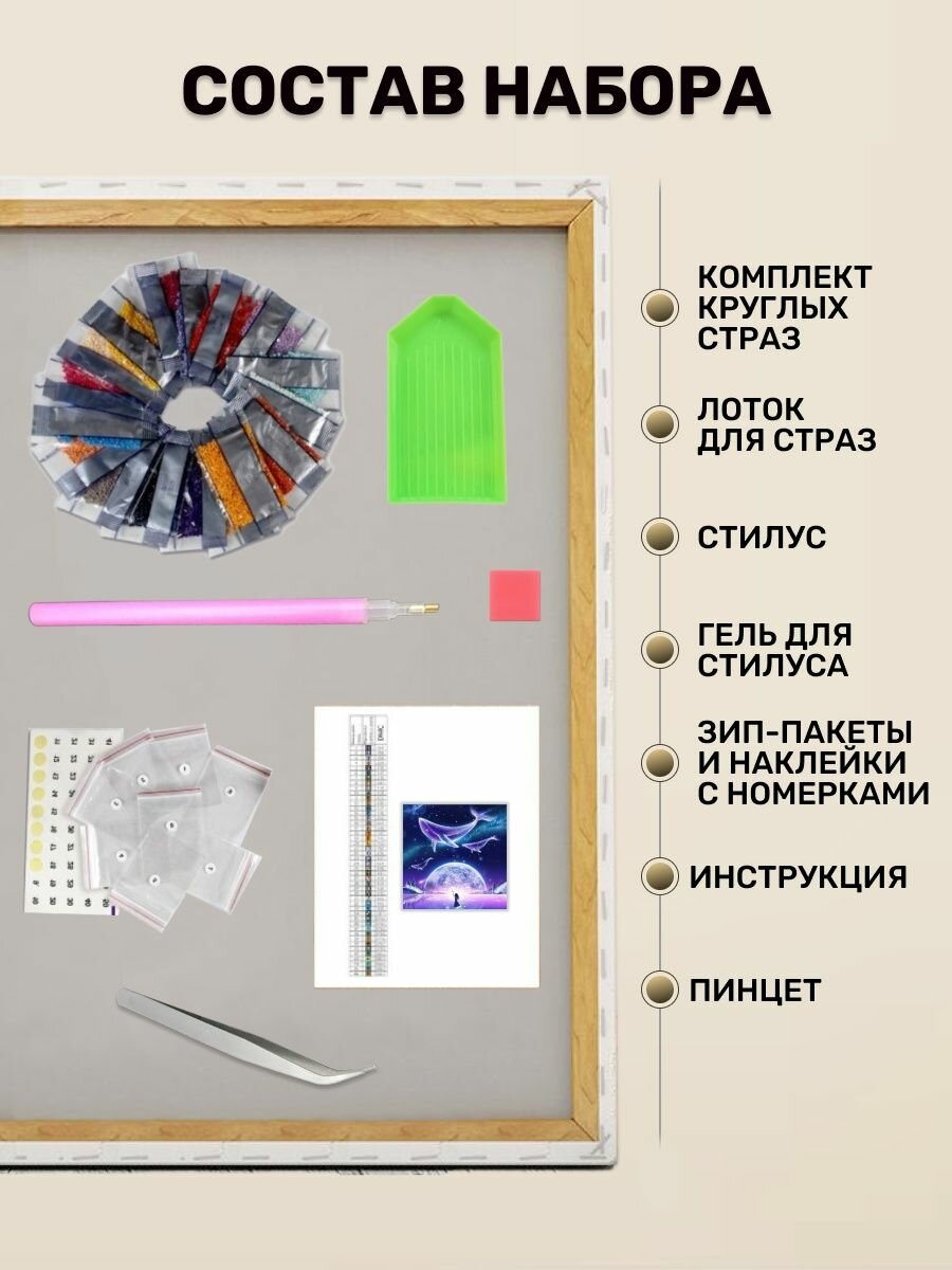 | Комплектация | холст на подрамнике;стразы;люминесцентные;клей;пинцет |