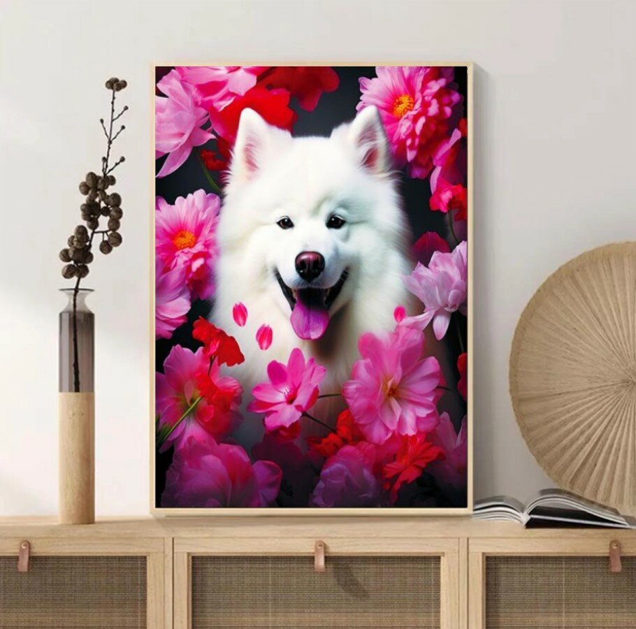 Купить Алмазная мозаика 40x50 см. на холсте с подрамником. Самоедская лайка в розовый цветах
