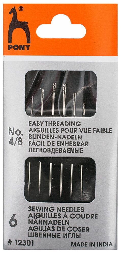 Иголки для шитья для слабовидящих легковдеваемые PONY Easy Threading № 4-8, 6 шт