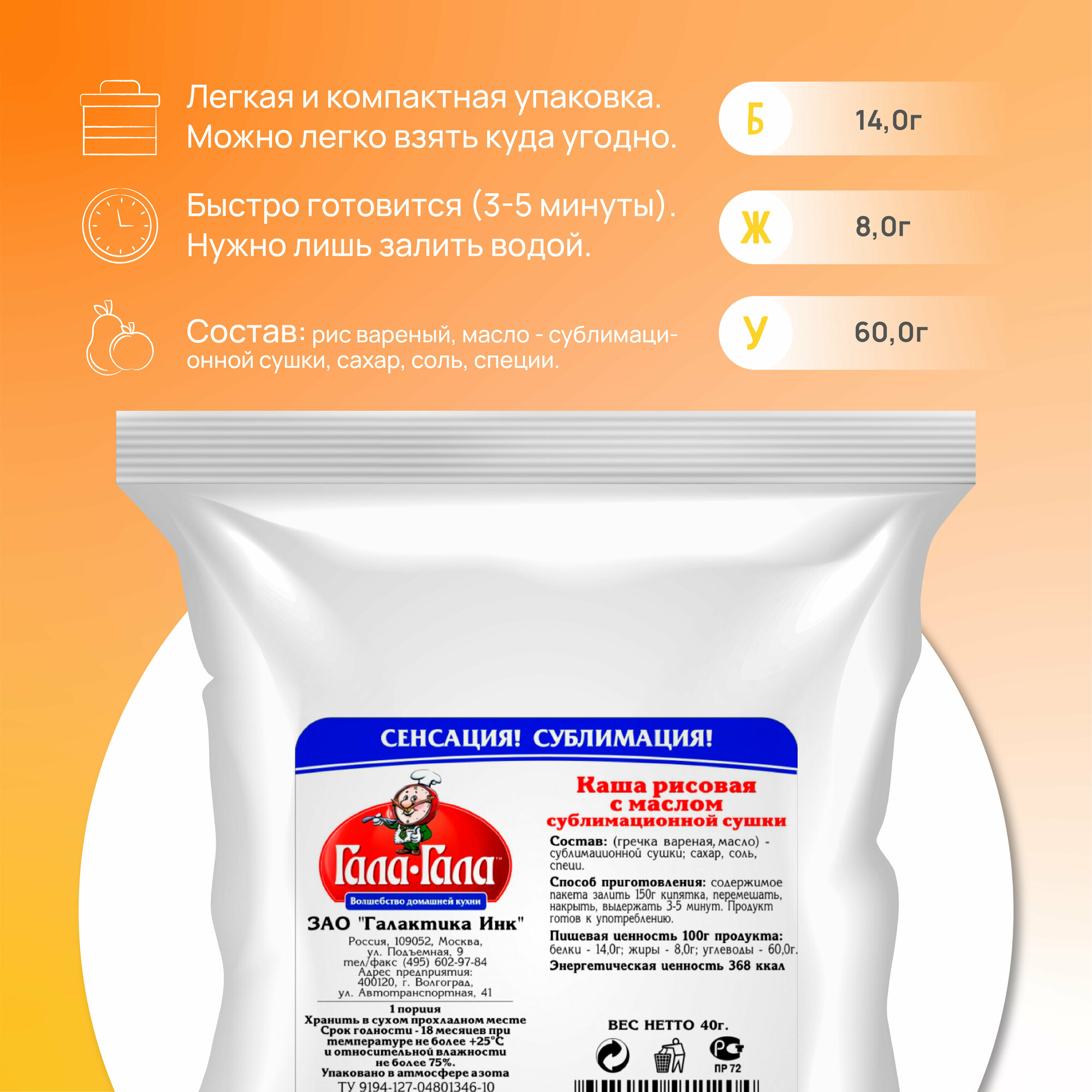 Купить Каша рисовая с маслом "Гала-Гала" 40 г/еда с собой/в поход/завтрак/обед/ужин/витамины/рис/фитнес/здоровое питание