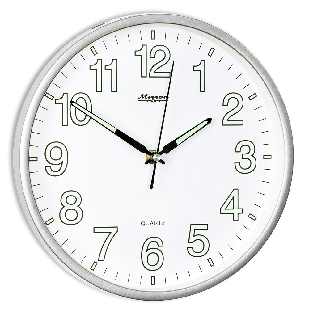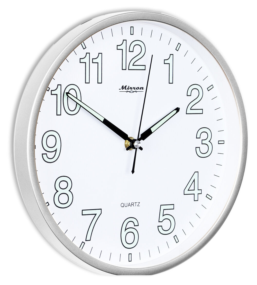 Купить Настенные кварцевые часы MIRRON P2864 СБ/Большие круглые часы/26 см/Белый (светлый) циферблат/Светящиеся цифры и стрелки/Серебристый цвет корпуса/Бесшумные кварцевые часы