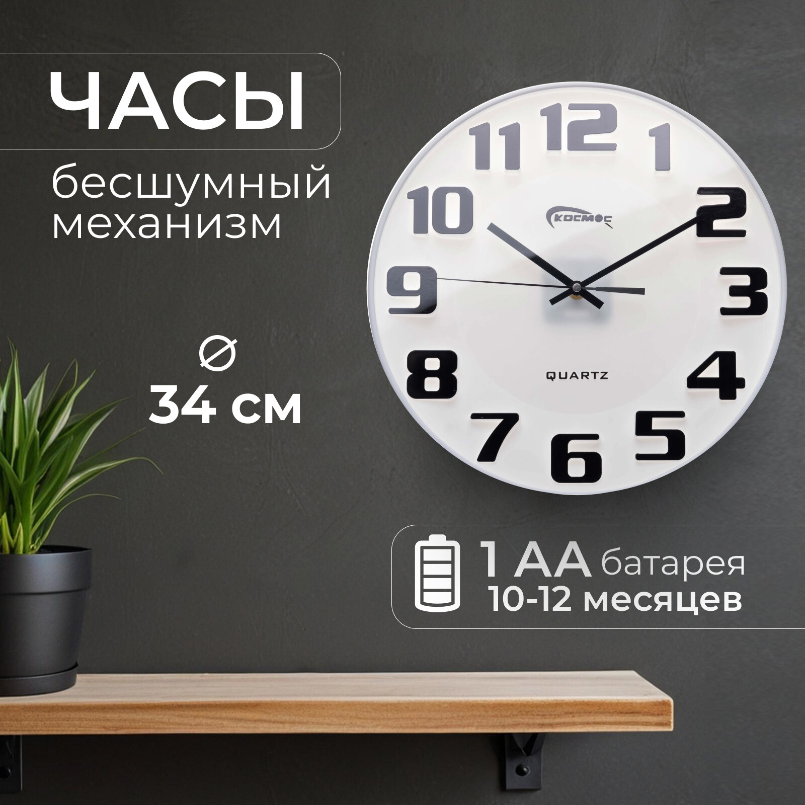 Купить Часы настенные большие круглые 34 см для офиса / бесшумные с плавным ходом / белые на кухню / в гостиную