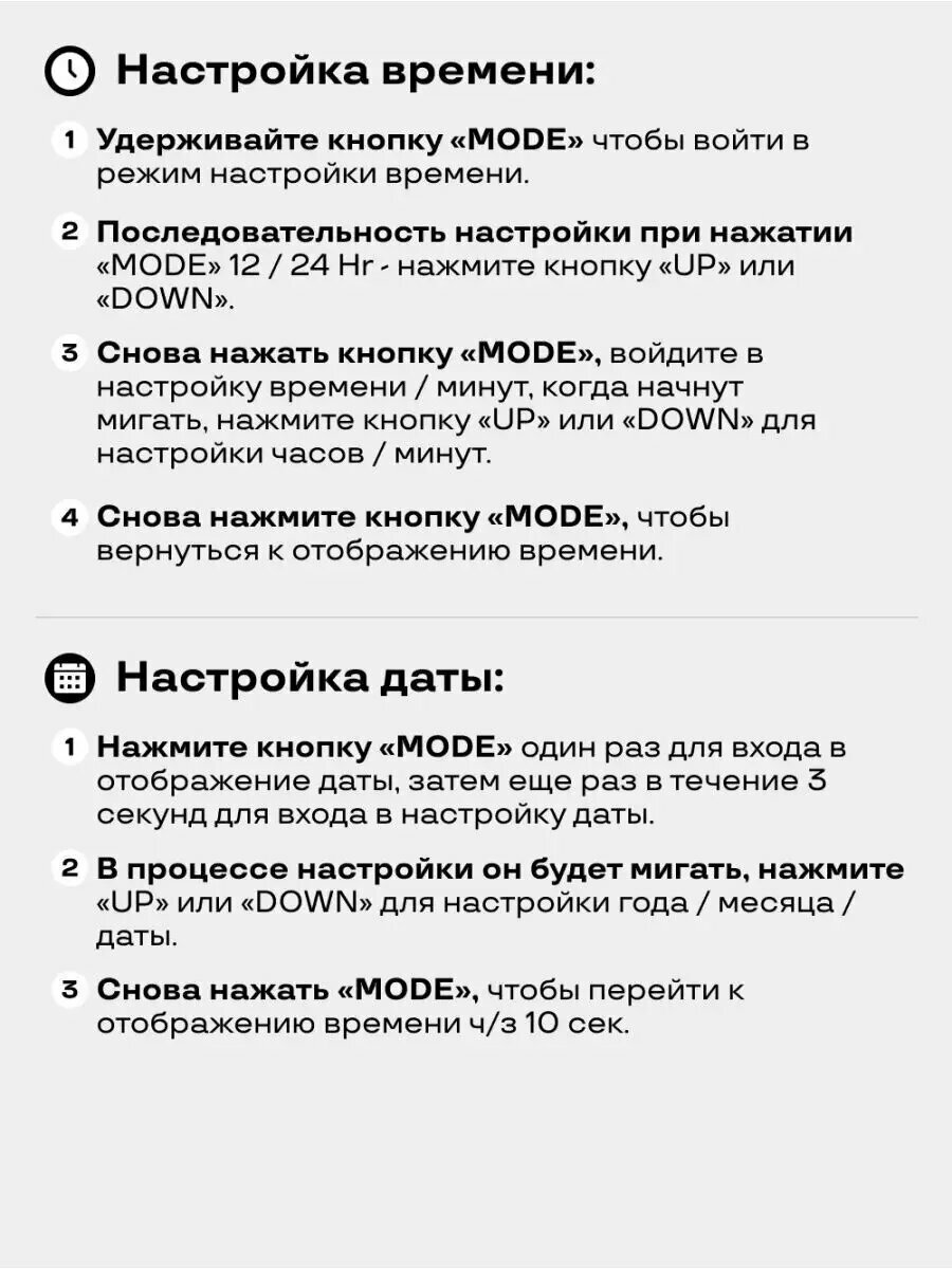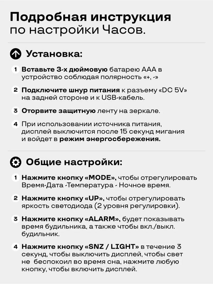 | Комплектация | инструкция, подставка для часов, usb кабель, 3 батарейки ААА, электронные часы |