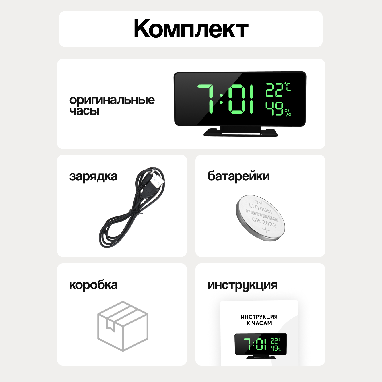 | Комплектация | инструкция, кабель, подставка, часы электронные |