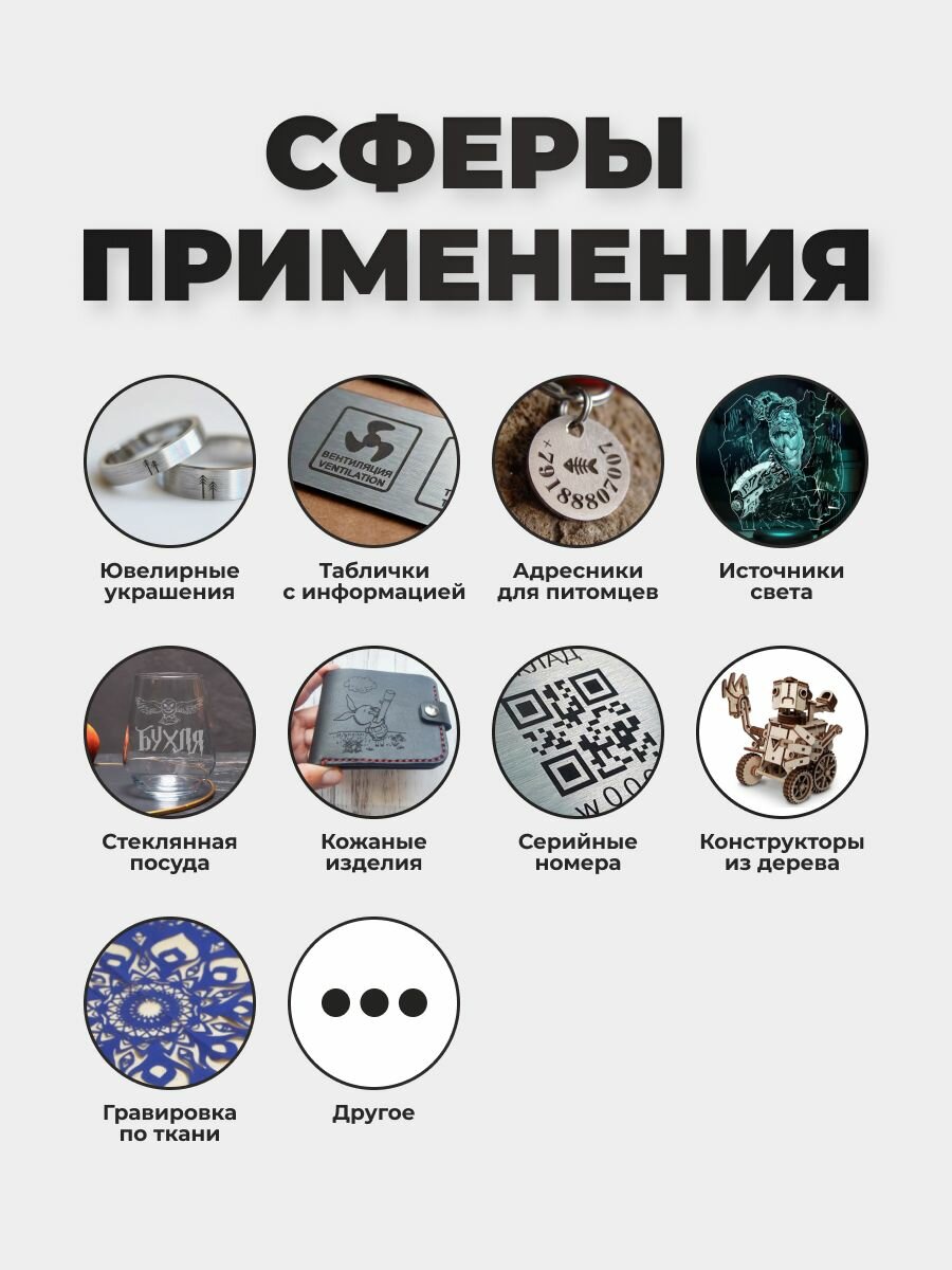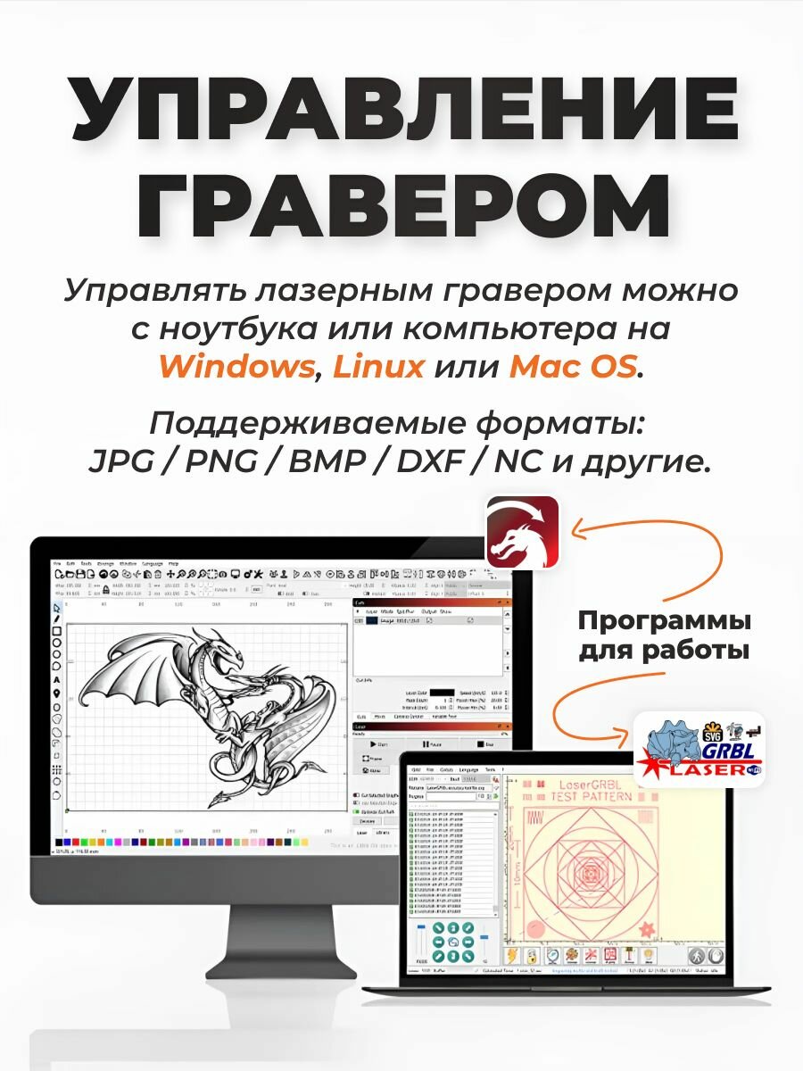 | Комплектация | Лазерный модуль с защитной крышкой Пластины для теста из дерева, алюминия и для акрила Лазерный гравер USB-кабель Кисть Ключ гаечный для сборки Кабельные стяжки Защитные очки Шестигранник |