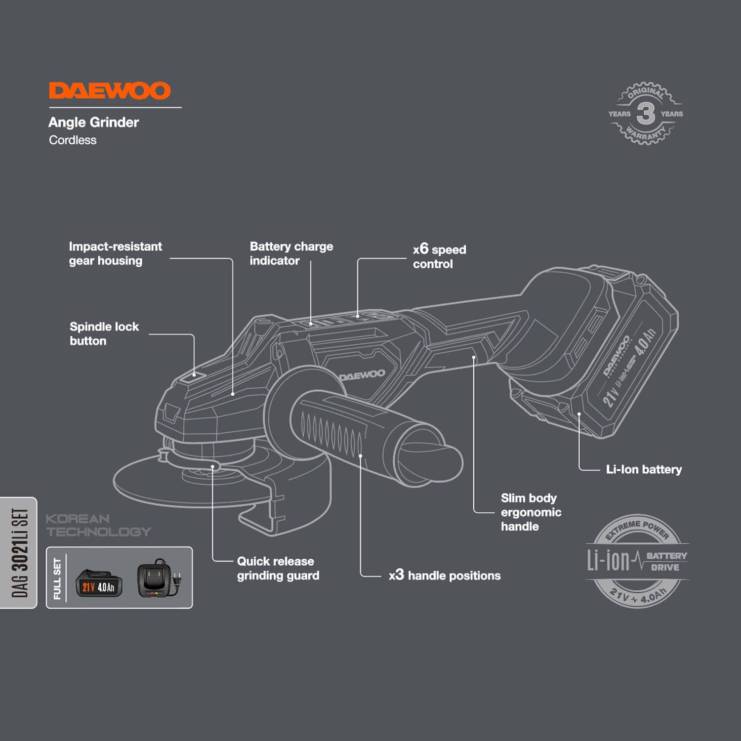 Угловая шлифмашина DAEWOO DAG 3021Li SET с АКБ 4 Ач и ЗУ интересное: