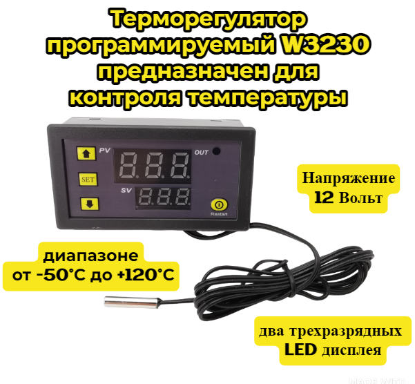 Терморегулятор программируемый W3230 предназначен для контроля температуры в диапазоне от -50°С до +120°С , напряжение 12 вольт интересное: