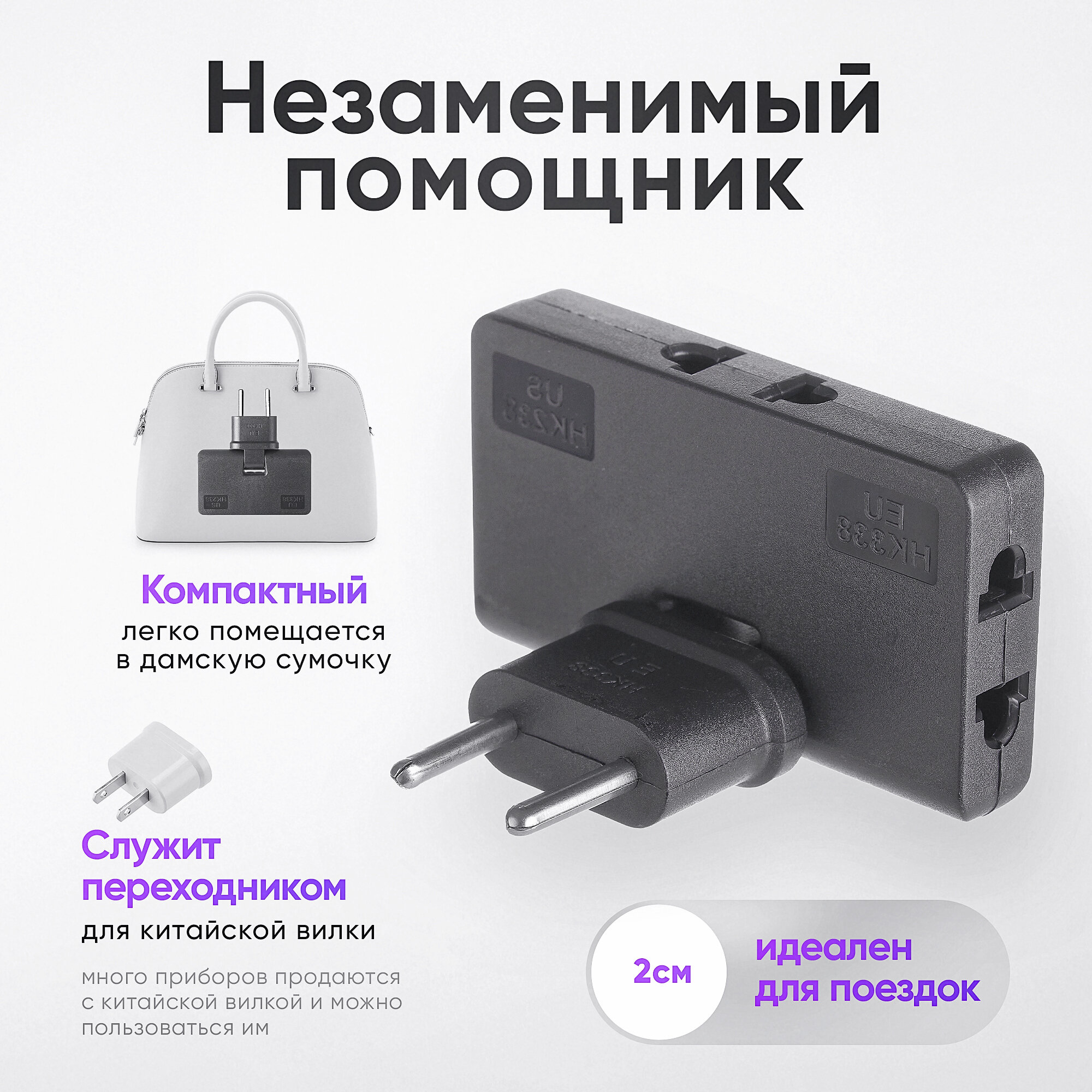 Адаптер сетевой на евровилку, евро розетку GSMIN Travel Adapter A34 переходник для американской, китайской вилки US/CN (250 В, 10А), 2шт (Белый)