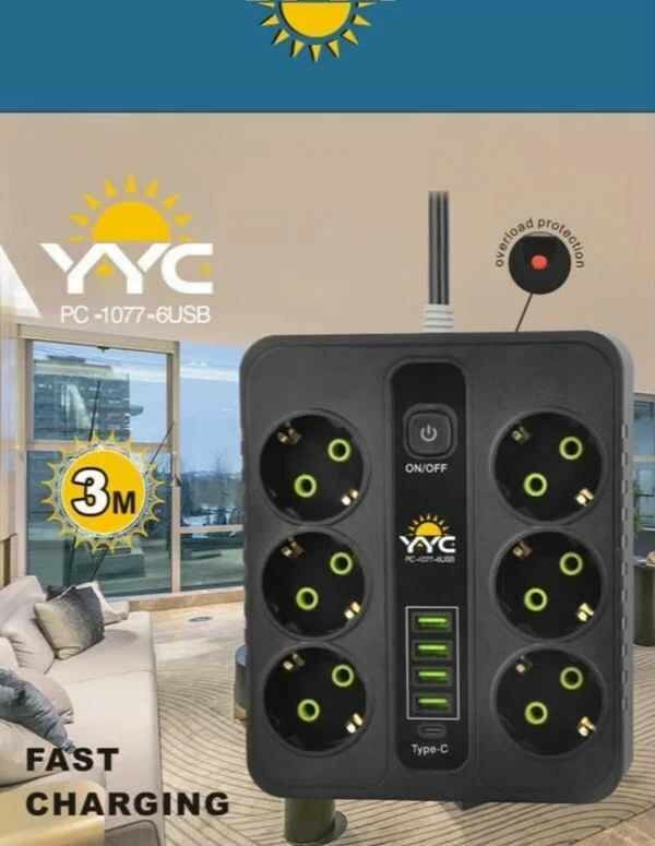 Удлинитель сетевой фильтр с заземлением, 6 розеток, 4 USB порта, 1 type-c, 3 метра, черный от GadFamily_Shop интересное: