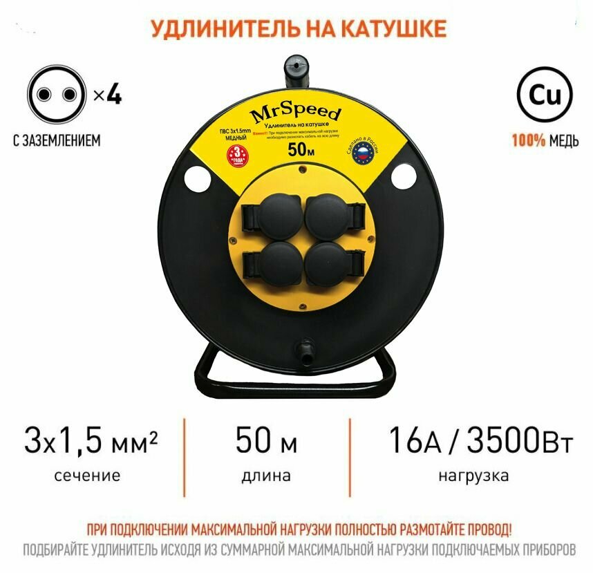 Купить Силовой удлинитель на пластиковой катушке c защитными крышками ПВС 3х1,5 mm 50 Метров/ IP54/ 4 Розетки/ С заземлением