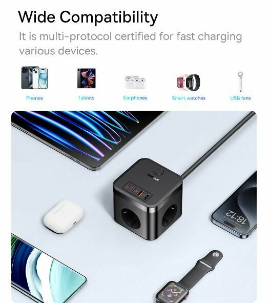 Сетевой фильтр удлинитель Baseus PowerCombo Cube Power Strip (7 в 1) 3AC (3-Розетки)+2U+2C 30W, длина кабеля 1.5m EU (E00066400117-00) интересное: