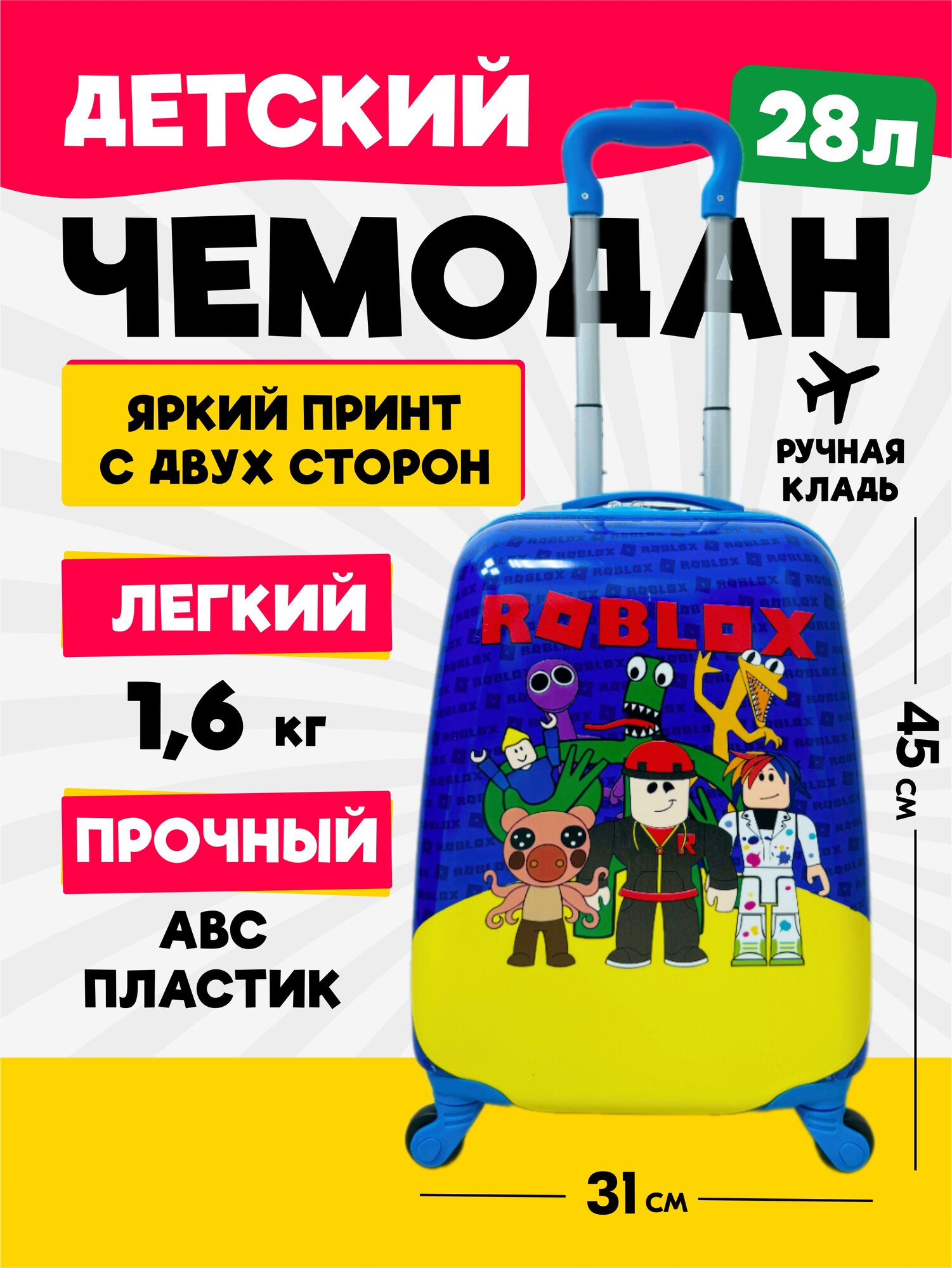 Купить Чемодан на колесах детский Роблокс. Ручная кладь, 45 см, 28 л. Дорожный чемодан на колесиках для путешествий и поездок.