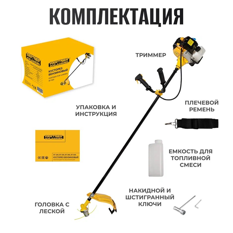 Триммер бензиновый / мотокоса бензиновая / Триммер Садовый Partner for garden BT-620 ( 4,9 л.с., 62 куб/см, катушка + НОЖ В подарок ) интересное: