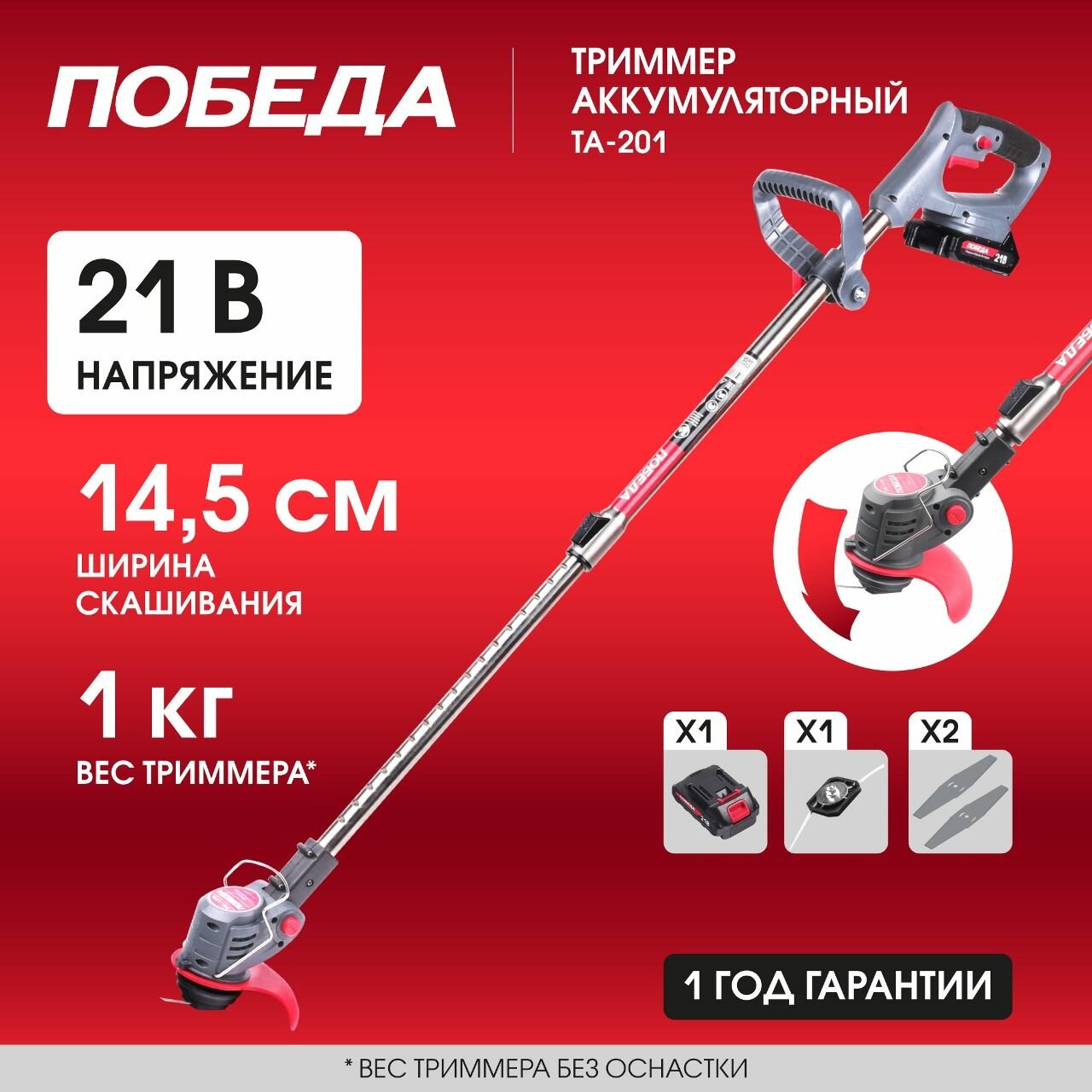 Купить Триммер аккумуляторный победа ТА-201, 20-21В, 1.5А*ч Li-ion, ширина скашивания 14.5см