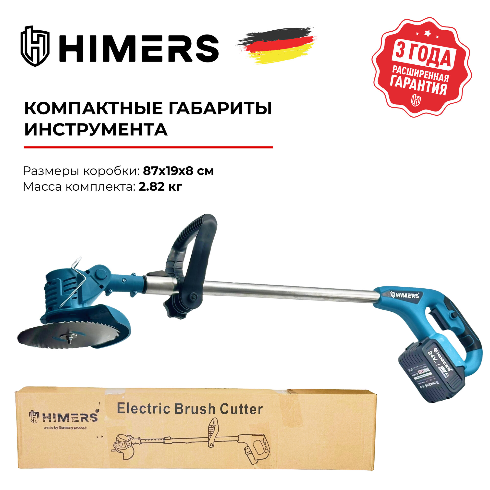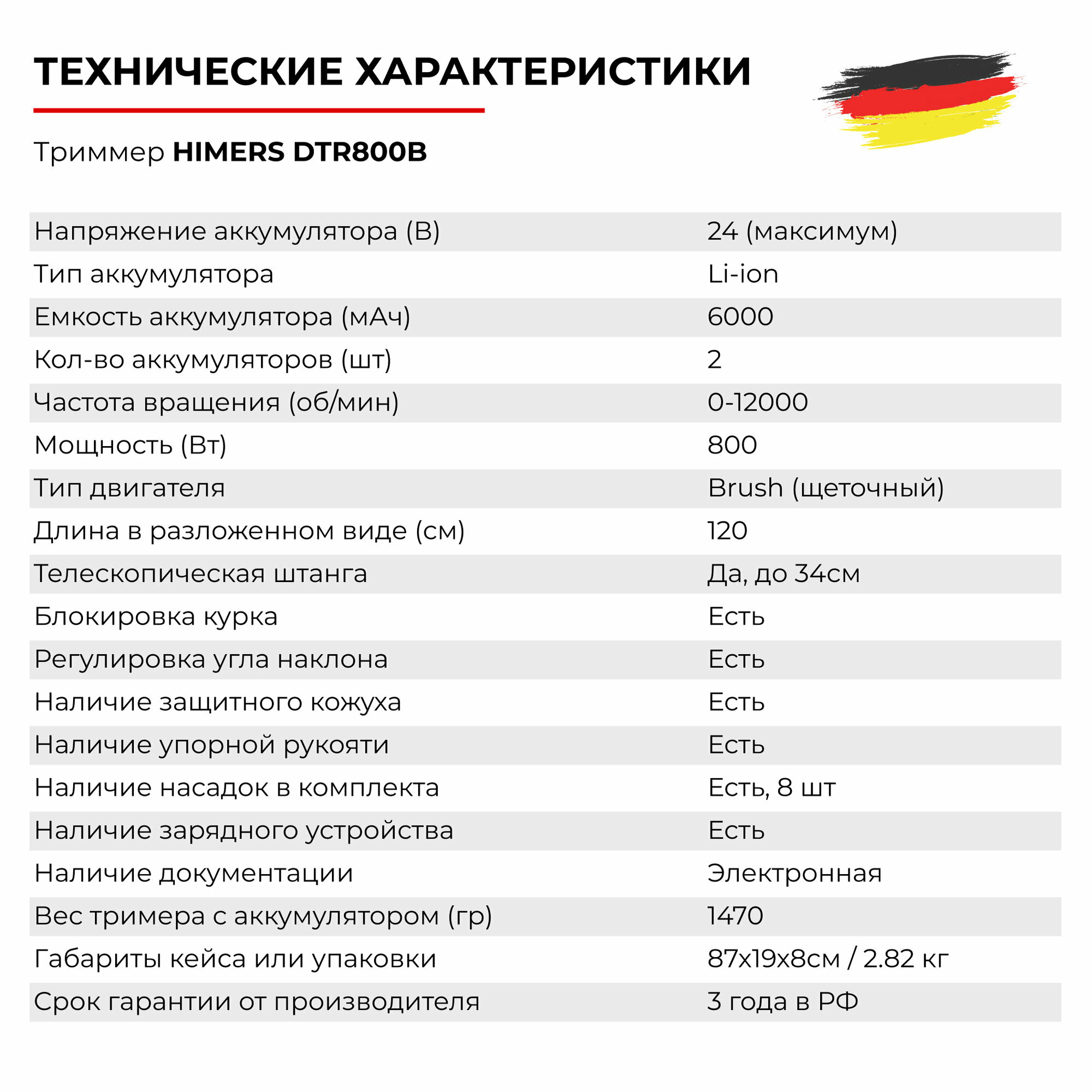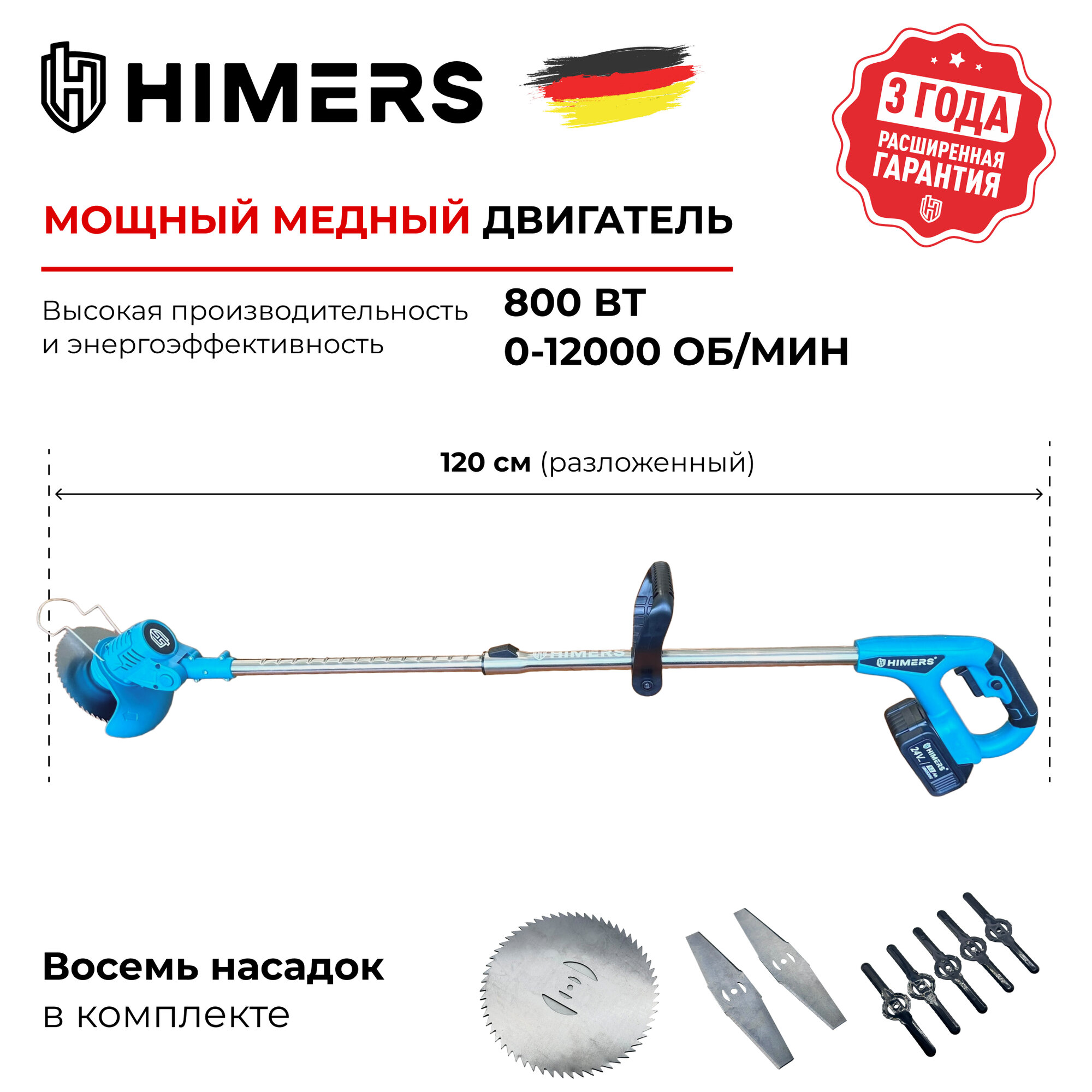 Садовый триммер HIMERS DTR800B аккумуляторный 24V, 2 АКБ по 6 А.ч, 800вт, 12000 об/мин / 8 насадок в комплекте интересное: