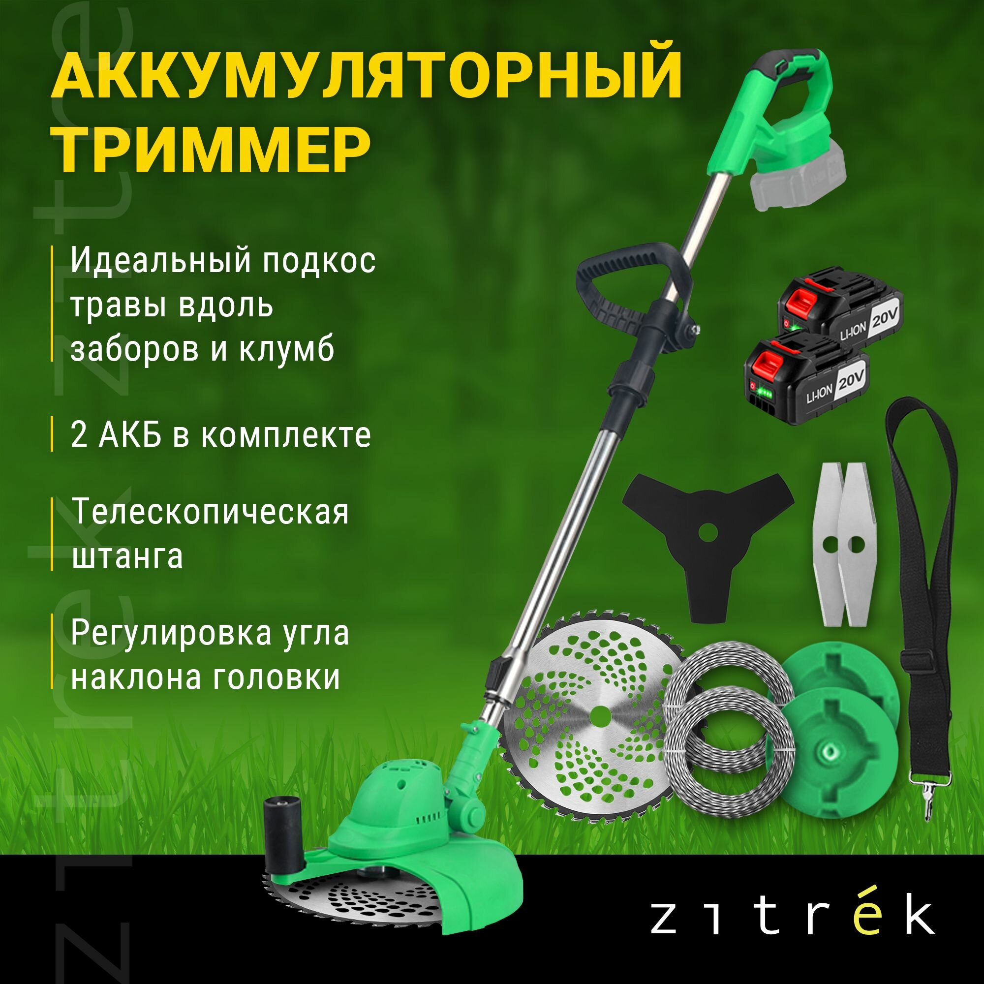 Купить Триммер аккумуляторный бесщеточный ZITREK GreenCut 20V (20В, Li-ion аккумулятор 2шт)