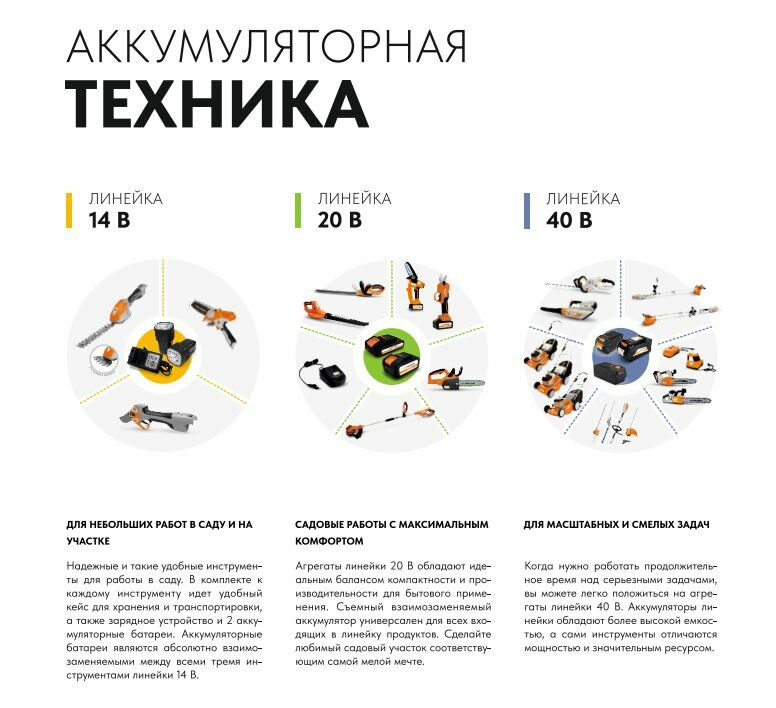 | Подробная комплектация | Триммер садовый аккумуляторный, головка с леской, 3-х лопастной нож, инструкция, наплечный ремень коробка. Аккумулятор и зарядное устройство приобретается отдельно! |