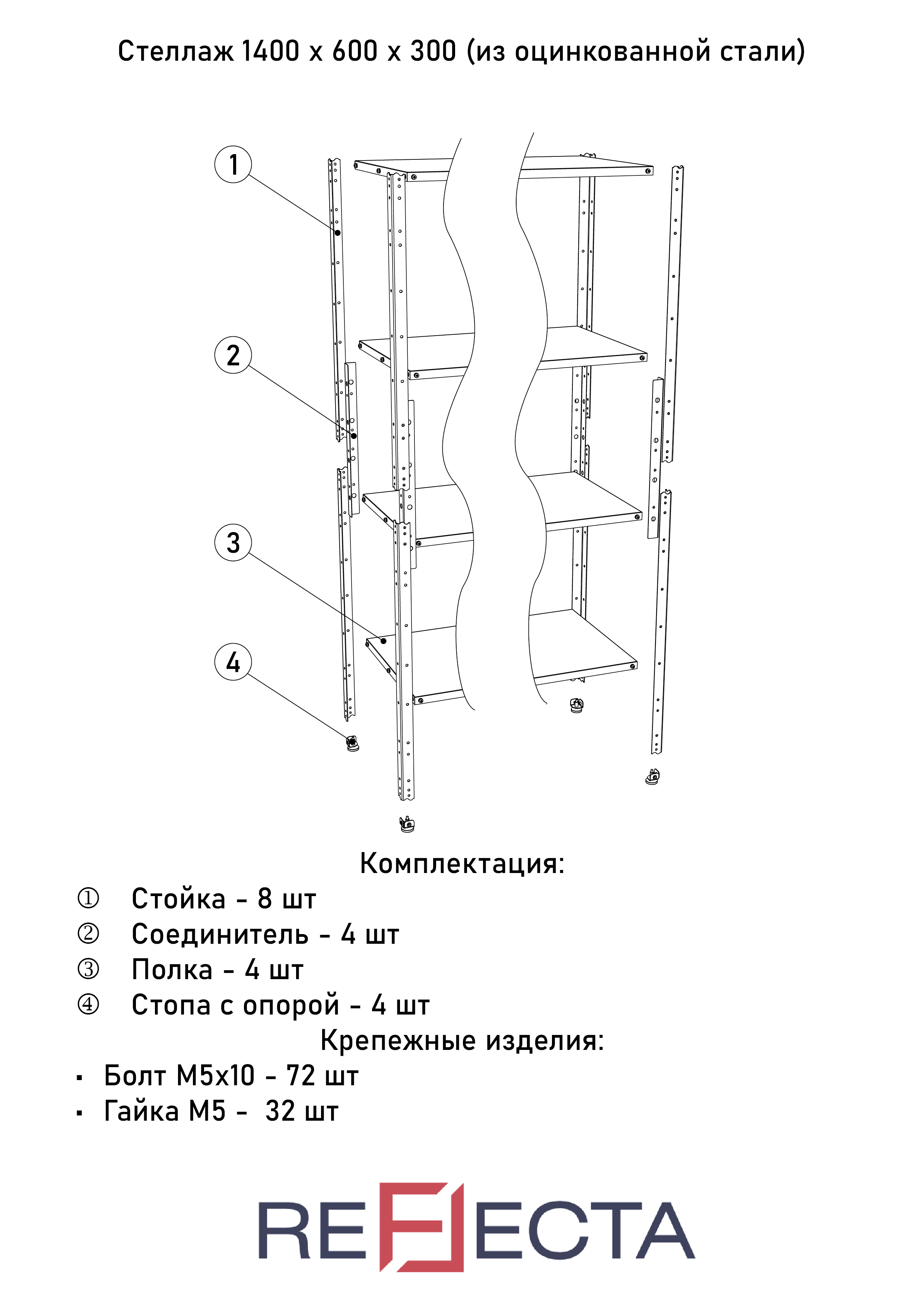 Стеллаж металлический 140x60x30. Четыре полки. Оцинкованный. RAL 9010