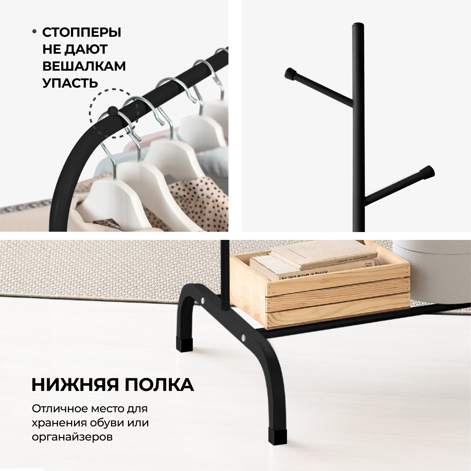 Вешалка напольная для одежды с полкой для обуви, черная, Bevelix интересное: