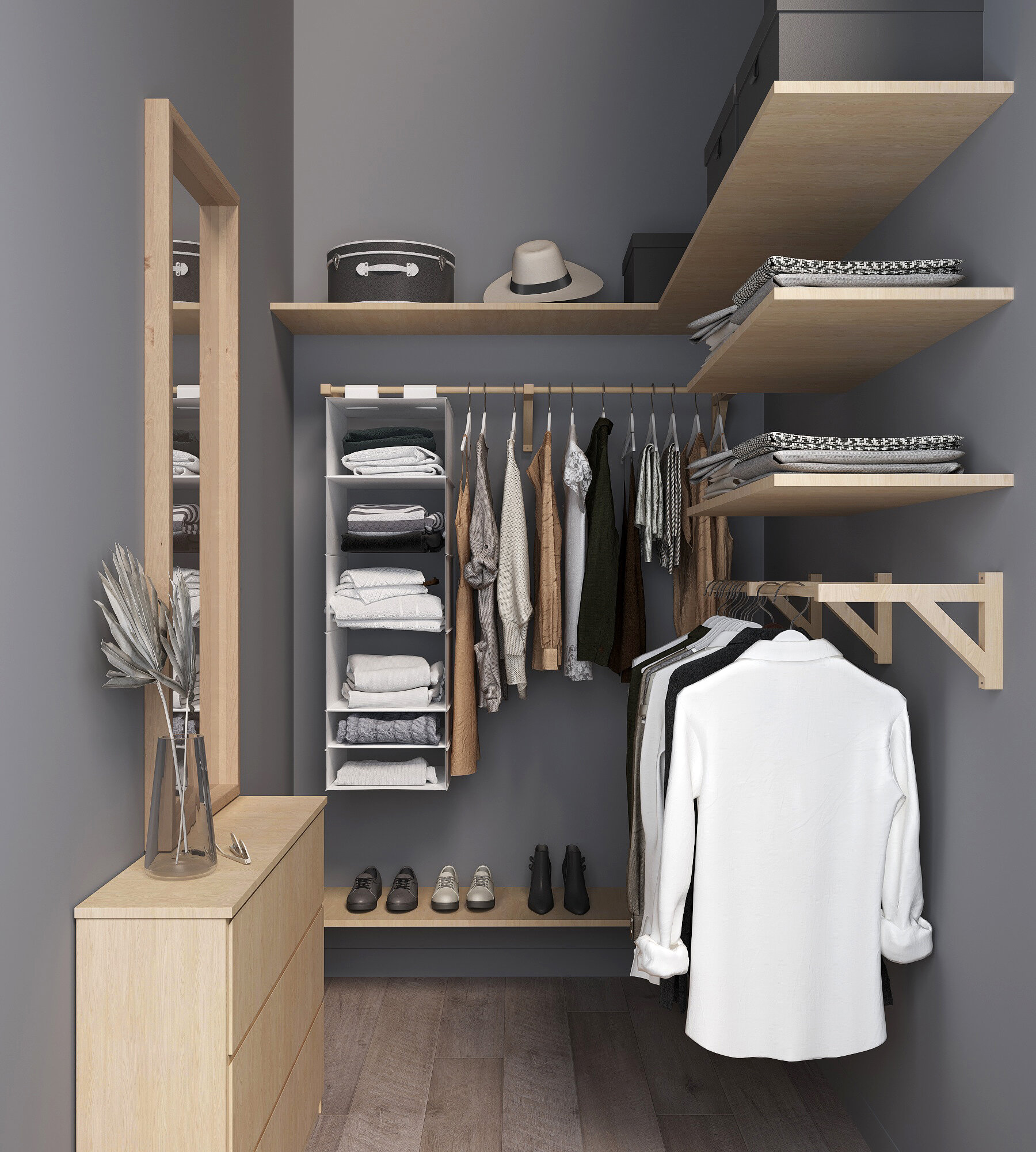 Полка-вешалка двойная c 2 штангами для одежды деревянная