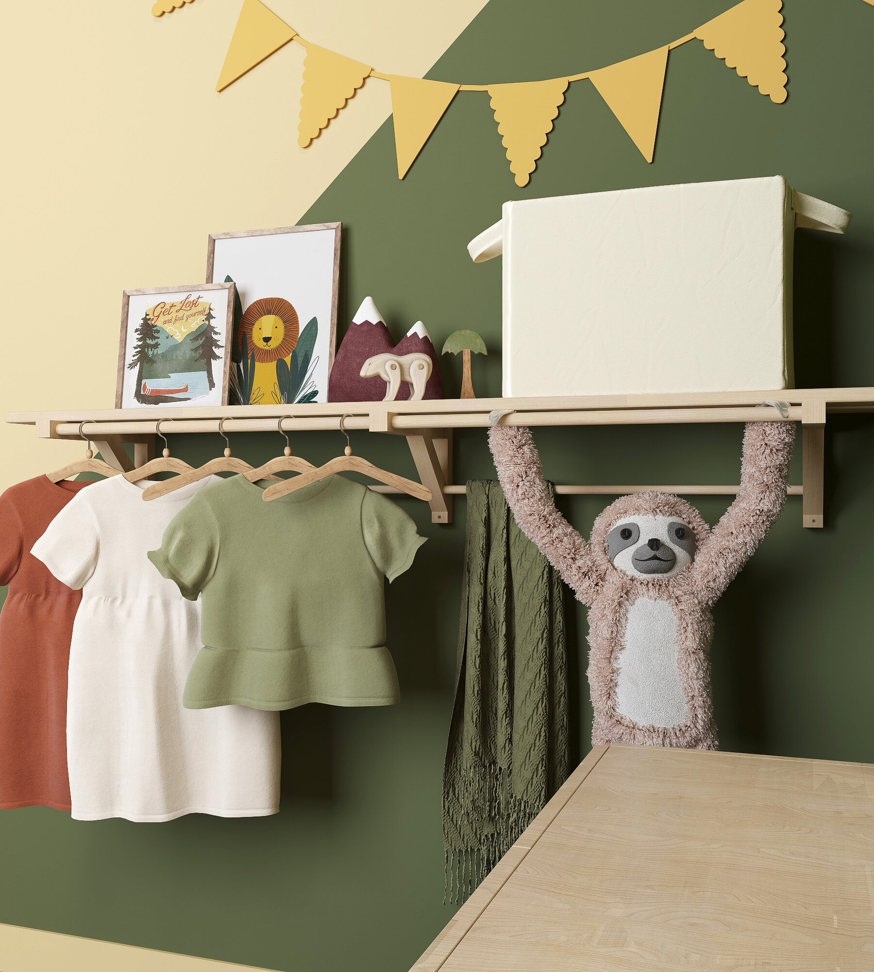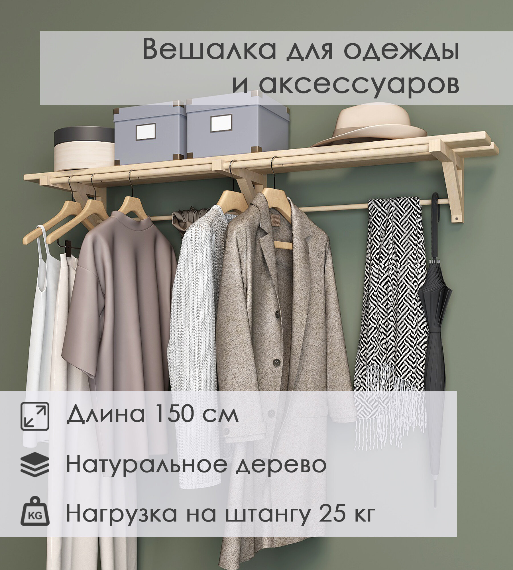 Полка-вешалка для одежды с 2 штангами деревянная