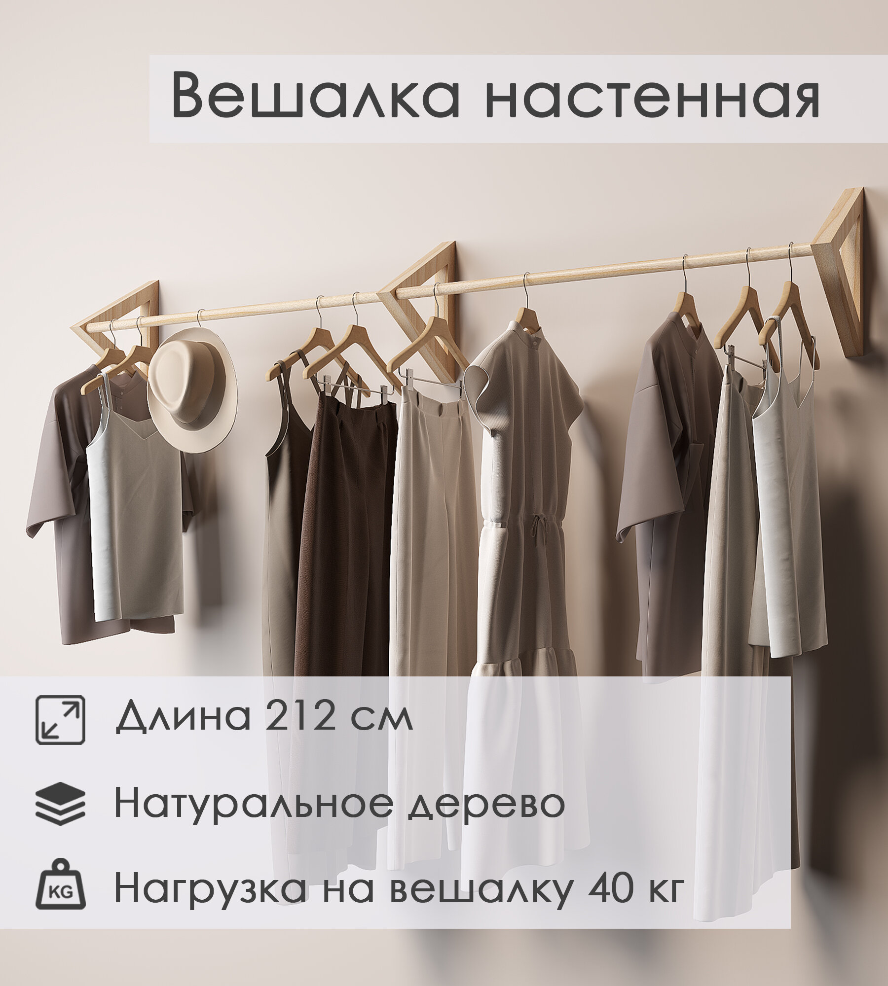 Вешалка настенная для одежды деревянная двойная, 212 см интересное: